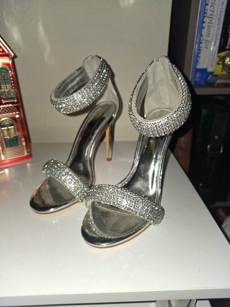 Brand New Jessica Simpson silver rhinestone heels sz 6. Would be perfect to wear with NYE dress. Bought 2 pairs of shoes for a wedding and wore the other pair.