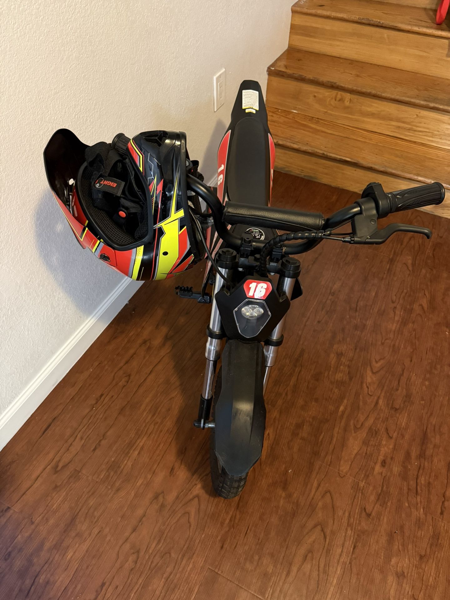 Red & Black Hiboy Electric Dirt Bike for Kids ages 5-7. Like new- does not include charger. Helmet, gloves, knee & elbow pads included!
