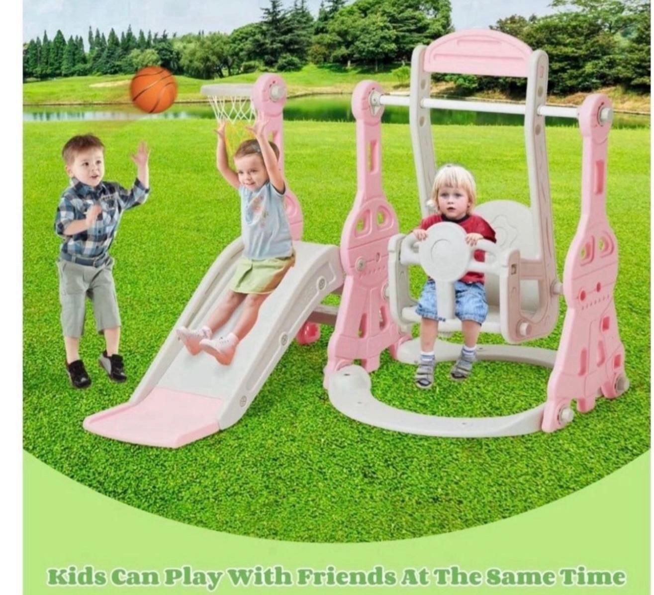 (VO37)(Firm price) Color Pink Maximum Weight Recommendation 140 Pounds Assembly Required Yes Age Range (Description) Kid 4-IN-1 TODDLER SLIDE AND SWING SET --- This 4-in-1 toddler activity set offers 4 functions for kids: a smooth slide, a non-slip climber, a sturdy swing and a basketball hoop, which is intended for family and domestic outdoor use. All activity elements are appropriately sized for toddlers.