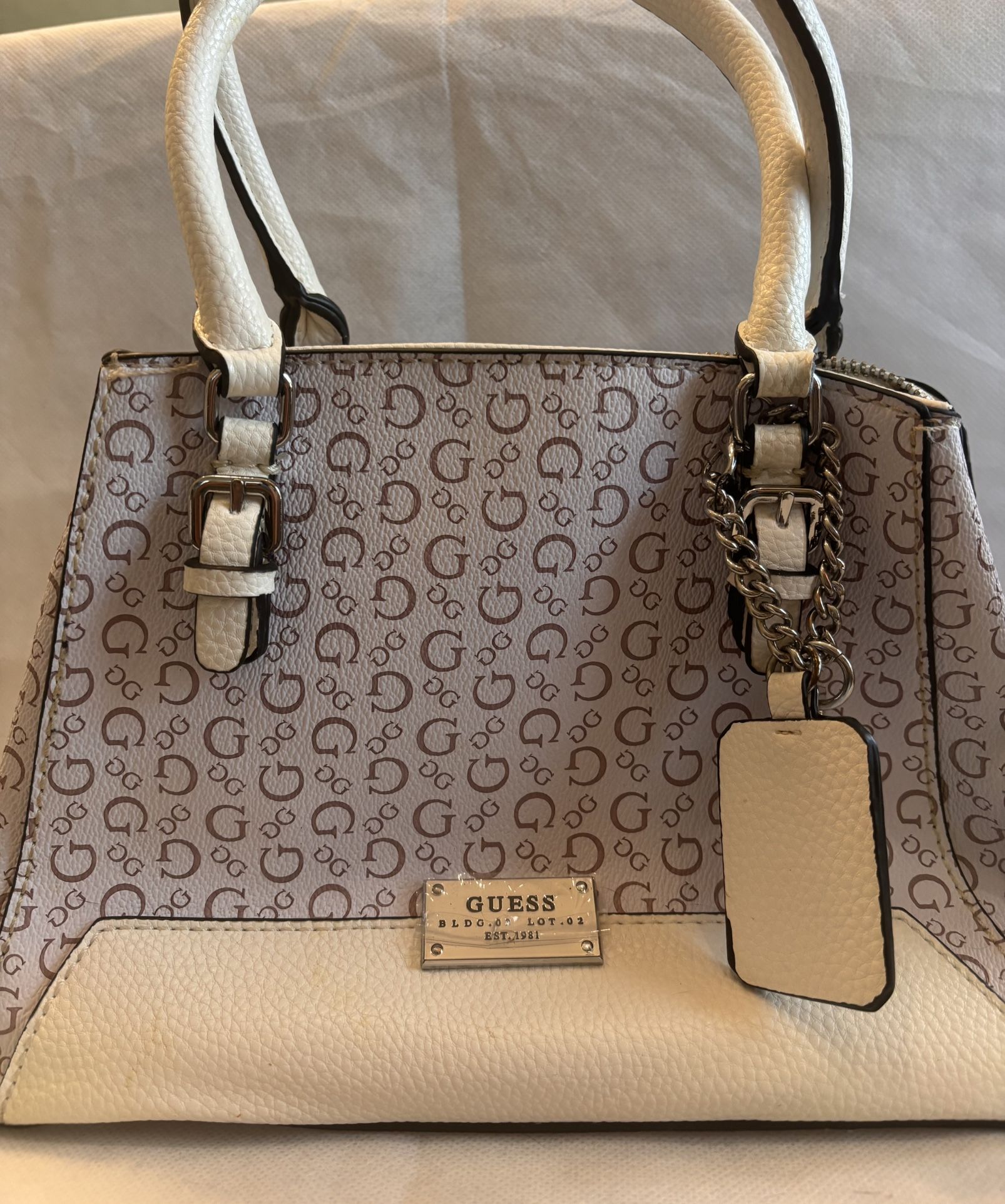 GUESS handbag/shoulder bag with logo print and gold hardware. NWOT 12”W x 8”H x 4”D Handle drop approximately 7”. Adjustable shoulder strap drop approximately 13” to 16”. Multiple compartments with zip center. Local pick up only in College Park. Will meet at Walmart on Old National . Cash, cash app, or Zelle. I do not hold items. $60 OBO