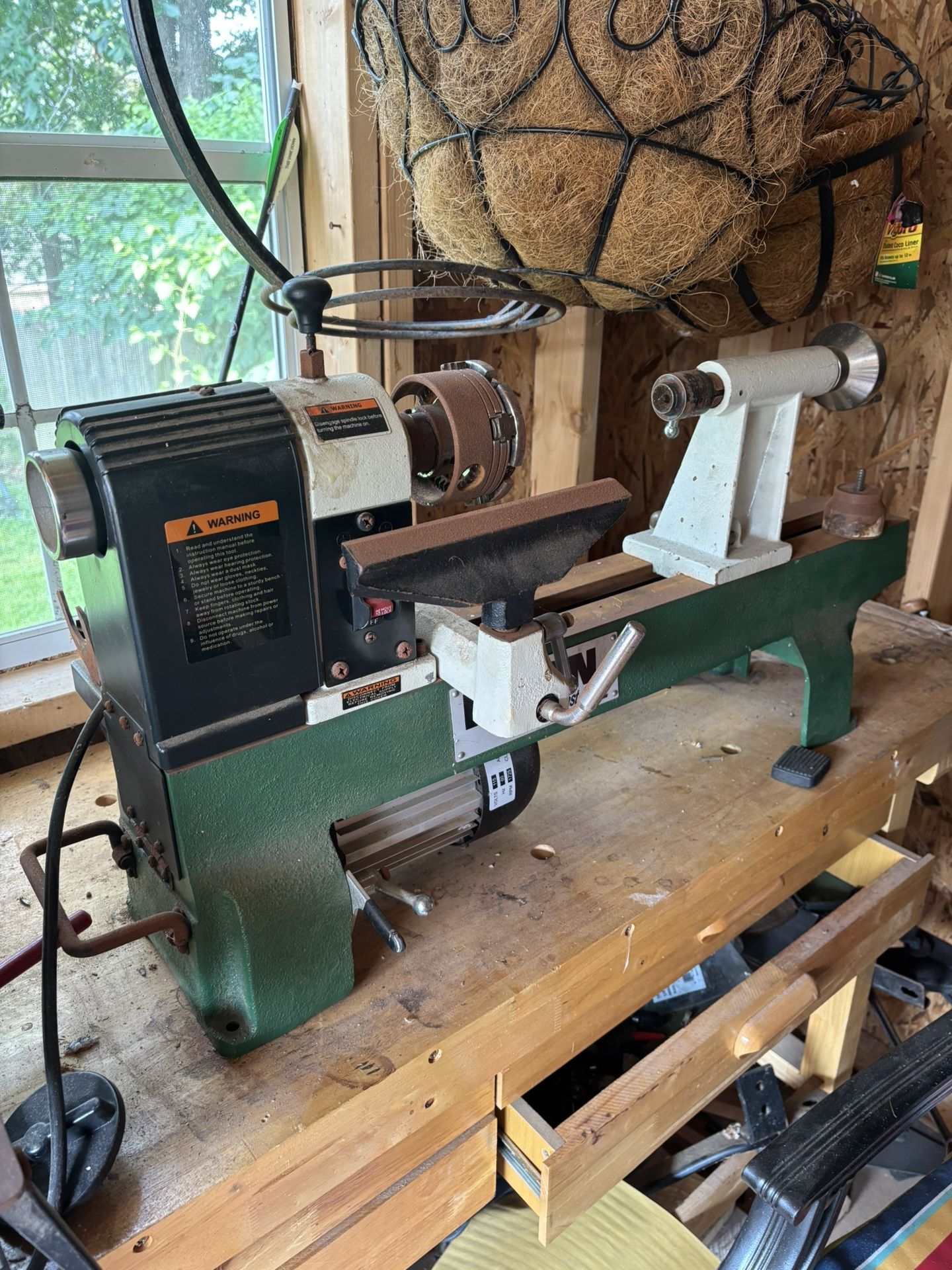 Rikon Mini Lathe with pinnacle tools, wolverine sharpening system, Grinder for sharpening, and chuck with small and large bowl plates. Plates not shown. It has been in shed for some time now and has accumulated some surface rust. All can be sanded off. I have some left over turkey slate call material from when I was turning calls. All is plugged in and can be seen working. It is heavy and will need 2 people to lift. $300 OBO. For local pick/ cash only. I am located in Clarksville TN. Thank you.