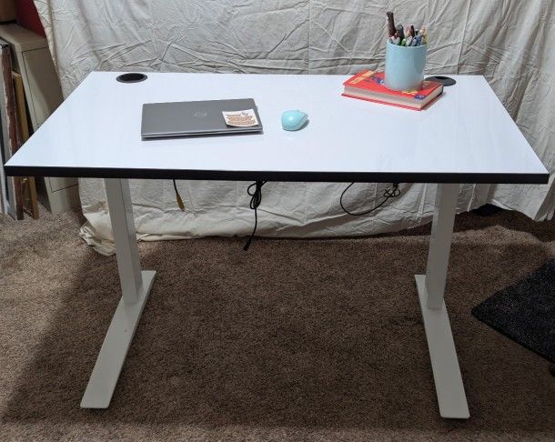 Sit stand desk made by fully. Depth: 27" Width: 48" Easily adjustable for sitting or standing with the press of a button. Lowest: 30" Tallest height: 49"