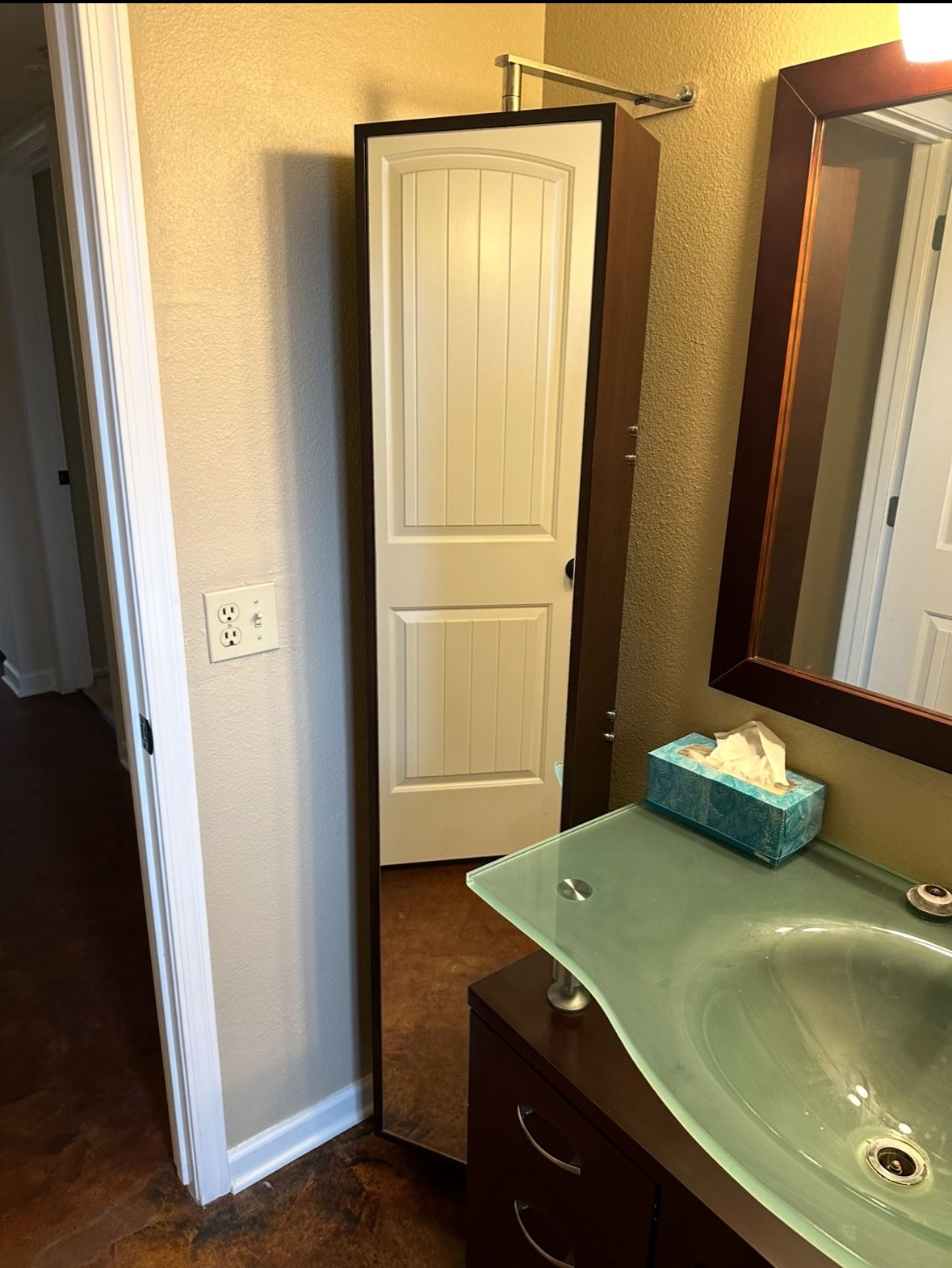 The full length mirror has attachments for the floor and back wall. The mirror rotates/spins so you can have it showing the mirror or rotate to access the storage. Color is dark brown. This has been uninstalled now but photos show how it looks when installed also. Located near Shea and 36th St, Phoenix. Cash only.