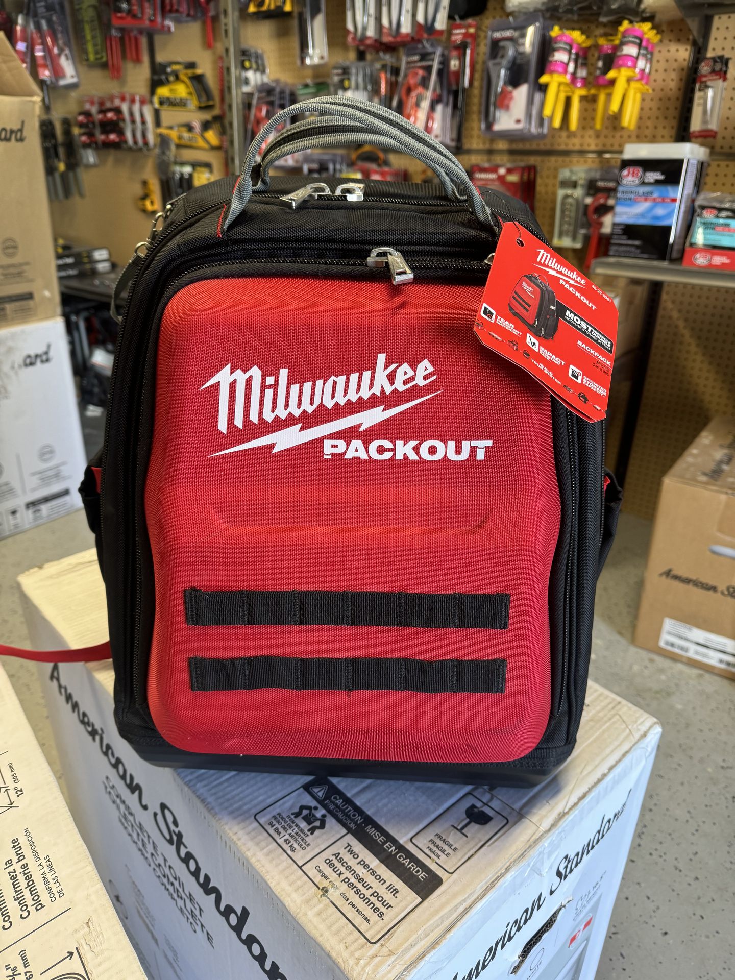 Milwaukee 15 in. PACKOUT Tool Backpack $90 firm price milwaukee back pack packout tool bag storage Hard shell electronics and equipment pocket Includes 48 total pockets Heavy-duty zippers Tape measure clip Reinforced side walls Daisy chains for additional storage Load-bearing harness with sternum strap Up to two times more padding than standard Plastic reinforced jab saw pocket Includes: Packout backpack Electrical plumbing small hand tools flat Phillips screwdriver set small drill impact M12 M18 fuel