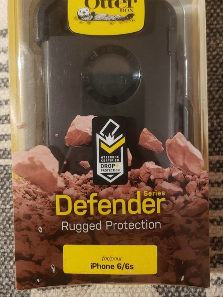Otterbox Defender Series case for Iphone6/6S. 4 parts. Comes with waist Clip/rubber exterior/2 plastic part peices that join together, holding phone in place.