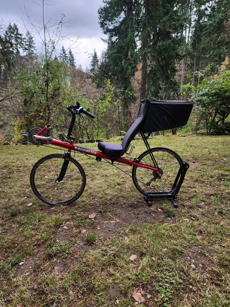The Bacchetta Strada is an amazing bike, with this one made all the more special by the inclusion of the extra large seat truck bag. You might wind up spending close to the purchase price of this bike just for the seat bag, if you were lucky enough to find one for sale. Not only does it hold a couple days worth of stuff, but it also improves the aerodynamics of the bike! Well, if you are looking for a high race recumbent at an affordable price with a carbon fiber front fork, this is your lucky day!