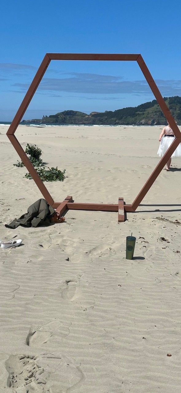 Nice wedding altar. Modern hexagon shape. It is 8 feet tall and 8 feet wide. Is custom made out of 4x4 material. Stained with exterior grade stain in Sequoia color. Has 2- 4 foot interlocking support feet. Includes all hardware to assemble. It is really simple to assemble and take apart for transport. These are $700 on Etsy.