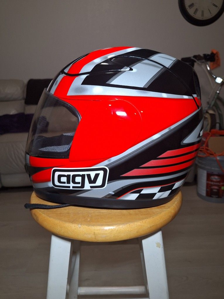 AGV is an Italian brand known for manufacturing motorcycle helmets since 1948, and their helmets are worn by both legendary racers and everyday riders. Up for sale is a great conditioned AGV helmet. Inside linning coming off, but you can always get it redone. Padding is in good shape. Only used it for a half a season. Sold as is. Priced to sell. Purchased in 2004. Low ballers ignored