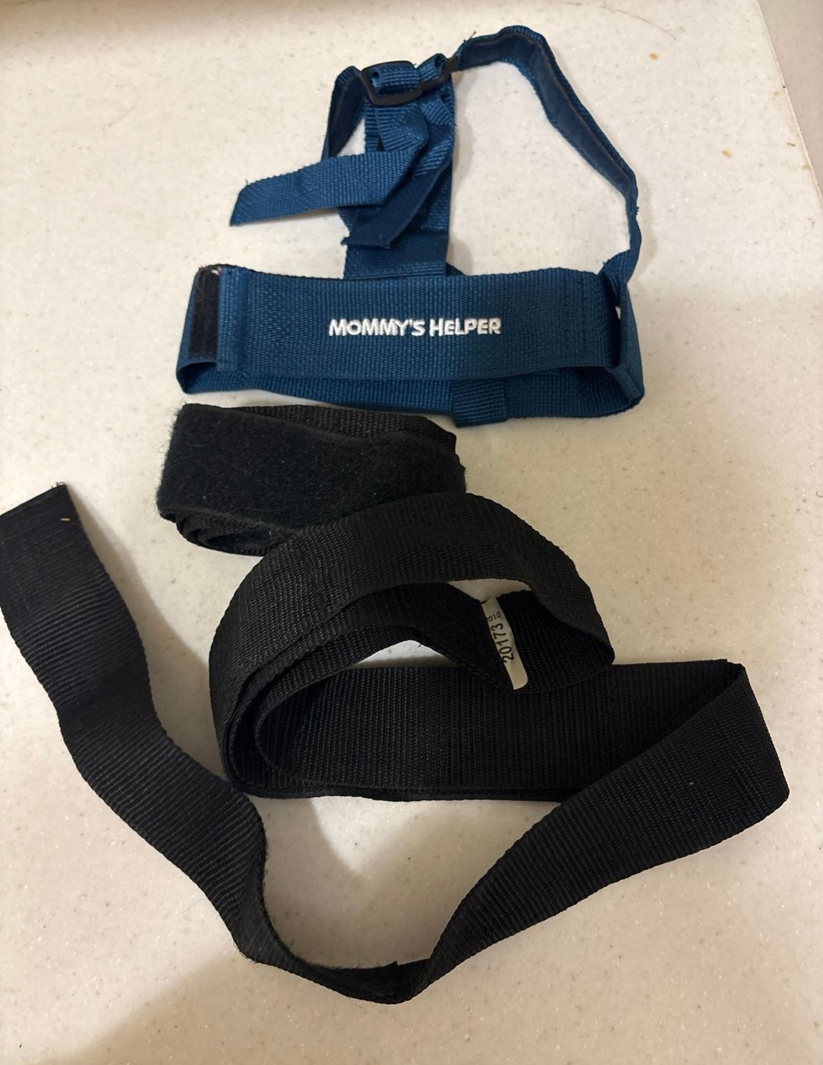 Mommy’s Helper child safety/walking harness strap set. Helps keep little ones close in crowded places (walks, parks, travel). Includes the blue “Mommy’s Helper” harness strap plus the black strap/leash pieces shown in the photos. Brand: Mommy’s Helper Color: blue & black Adjustable straps with Velcro/clip closures