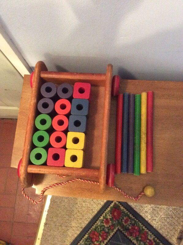 VINTAGE PLAYSKOOL WOODEN PULL WAGON WITH 15 BLOCKS, AND 6 STICKS