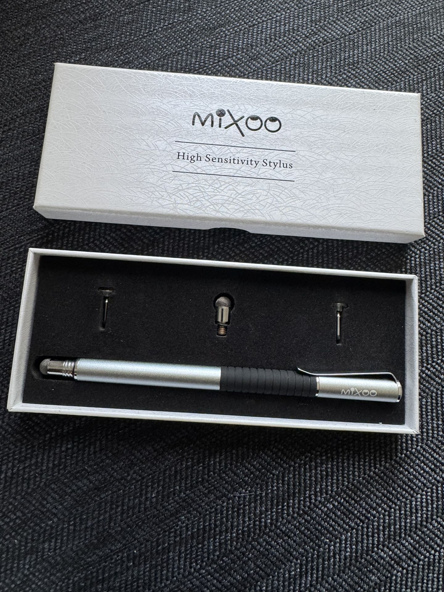 Mixoo stylus pen for touchscreen, 2-in-1 Disc and fiber tip sensitivity and precision. Stylus for iPad, iPhone tablet, phone Chromebook, all touchscreen devices Gray Protective cap Replaceable high precision clear disk Rubber grip Aluminum body Micro-knit hybrid fiber top Length 5.6” (14.3cm)