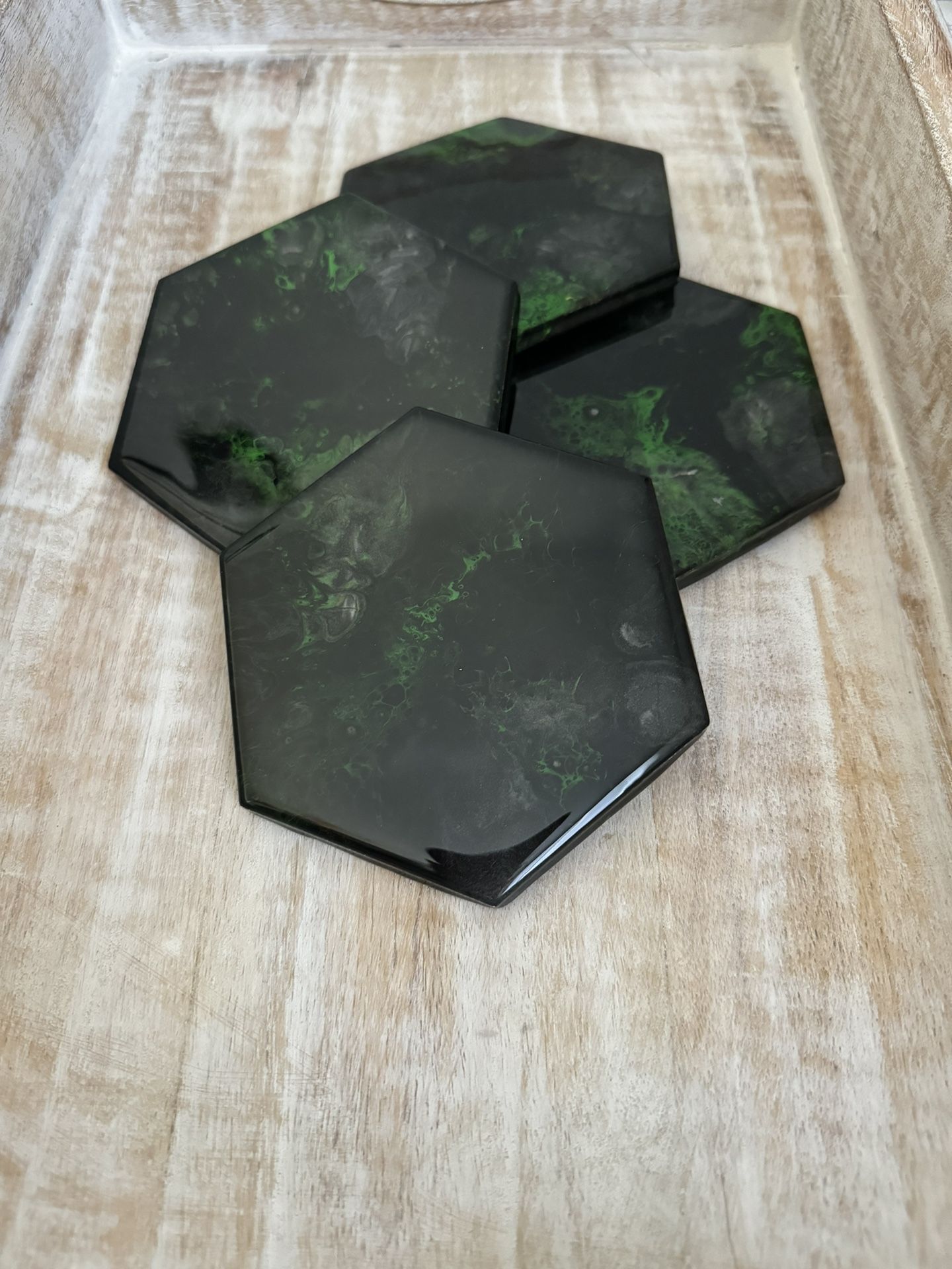 Set of 4 Ceramic tile coasters Hexagon shape Acrylic Pour Art technique finished with epoxy resin Handmade Never used I can ship for additional cost.