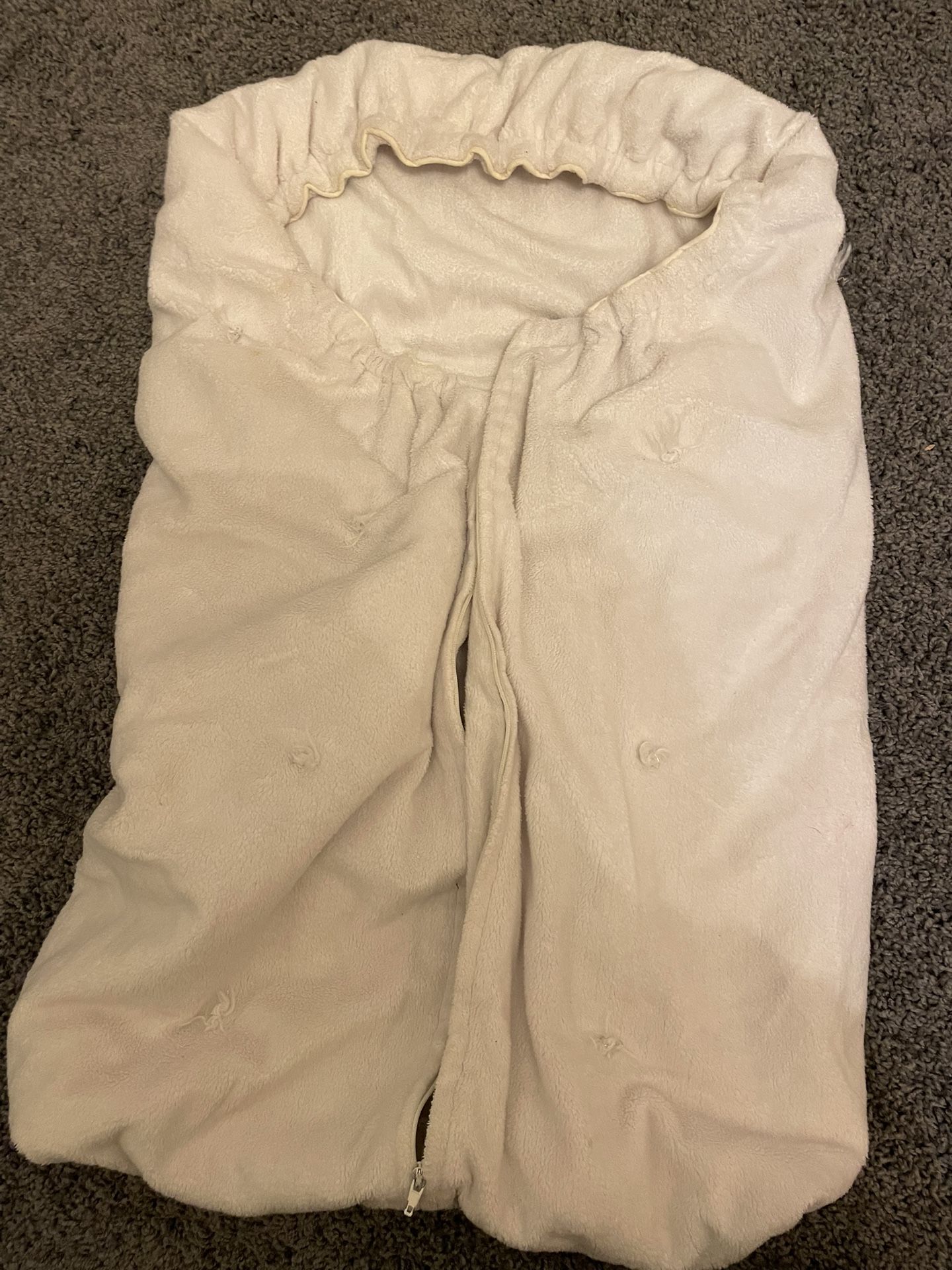 Newborn to about 8 months. Handmade bunting for inside stroller or car seat. Holes for buckles. White fuzzy