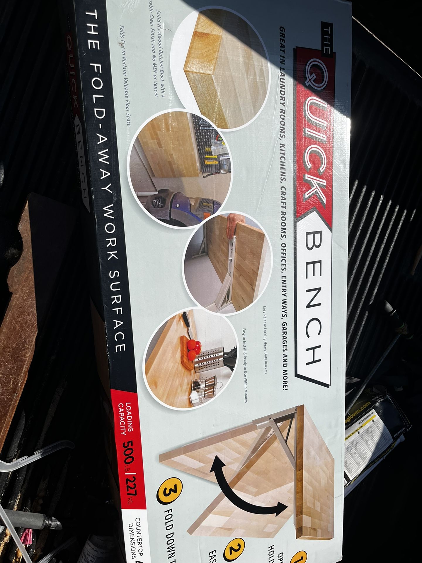 Folding work bench. Very easy to install, I have one in my garage they sent me two. Brand new in box never opened. Perfect bench for space saving.