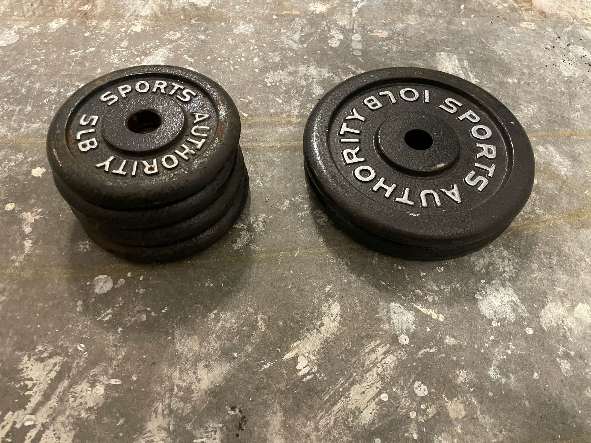 Set of cast iron weight plates by Sports Authority. Includes 2 Γ 10 lb plates and 4 Γ 5 lb plates for a total of 50 lbs. Standard center holes, solid and durable, great for home gym setups or adding weight to an existing bar. Normal cosmetic wear from use, no cracks. π΅ Cash only π Pickup in Coral Gables
