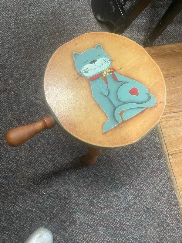 Vintage Wood Stool With Painted Kitty Cat 12"