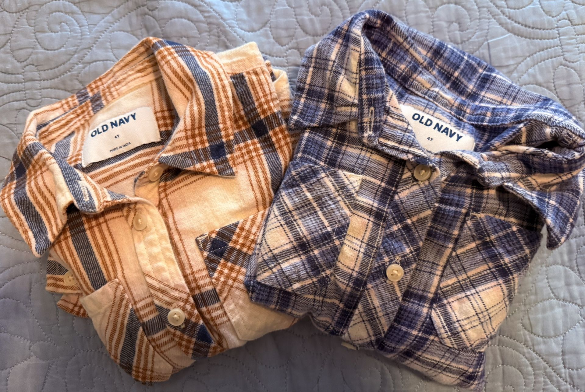Stylish plaid shirts from Old Navy. Features cream and blue tones. Perfect for casual outings. * pointed collar * long sleeves * buttoned cuffs * patch pocket * full length button front * rounded hem * all-over plaid * relaxed fit * hits below waist * soft cozy flannel * 100% cotton * Colors: cream plaid and blue plaid * Smoke and pet free home * No rips, stains, or holes