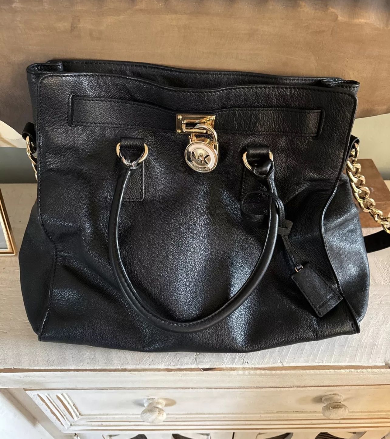 Michael Kors Hamilton Black Large Satchel Handbag With Lock and Key Chain Strap