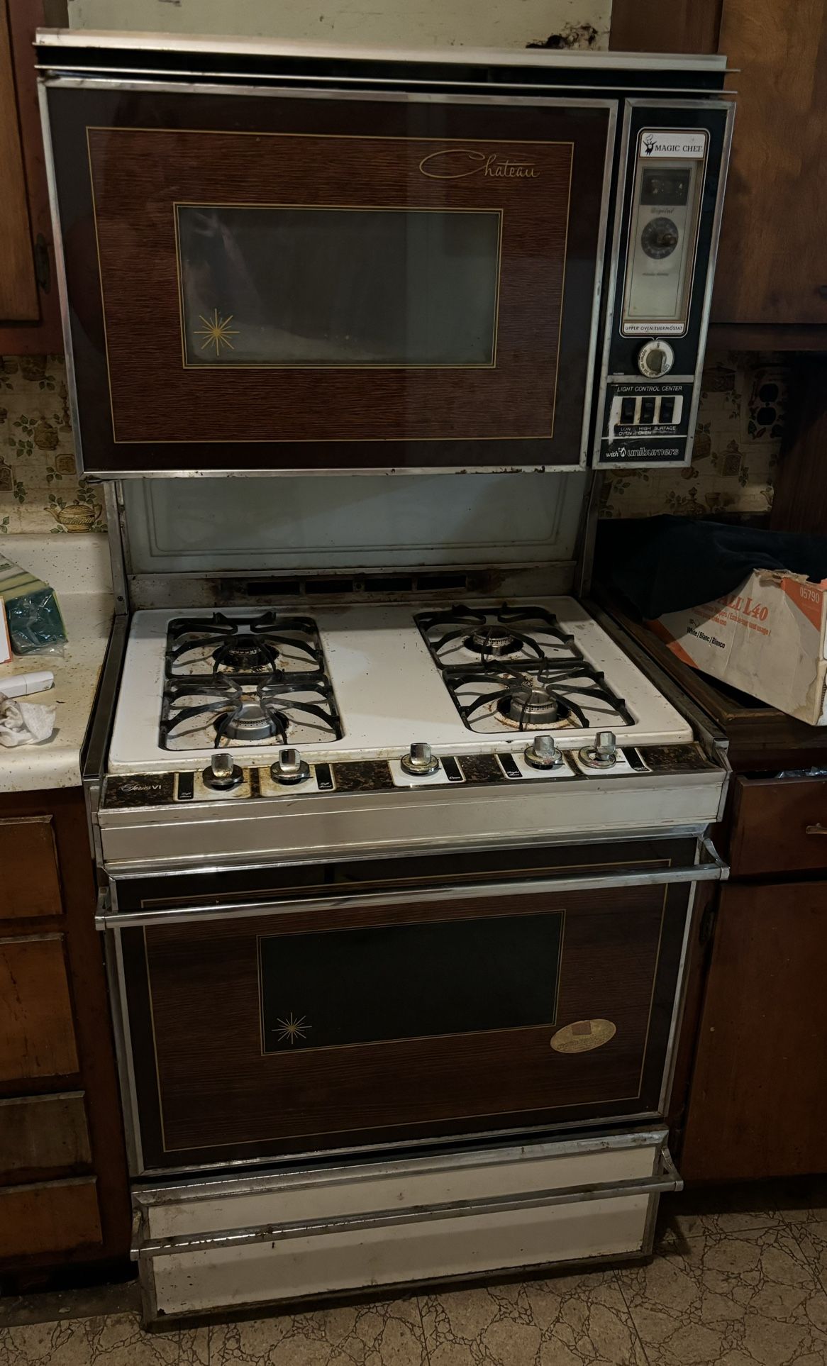 Older Stove and double oven, one on top and bottom. Still works perfectly fine just needs cleaned. Pick up only
