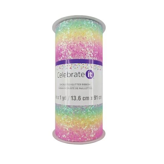 Add this encrusted glitter ribbon to your DIY craft projects and home décor. Featuring a pastel rainbow finish, this ribbon will make your project stand out. Details: Pastel rainbow 5.375" x 1yd. (13.6cm x 91cm) Polyester and plastic