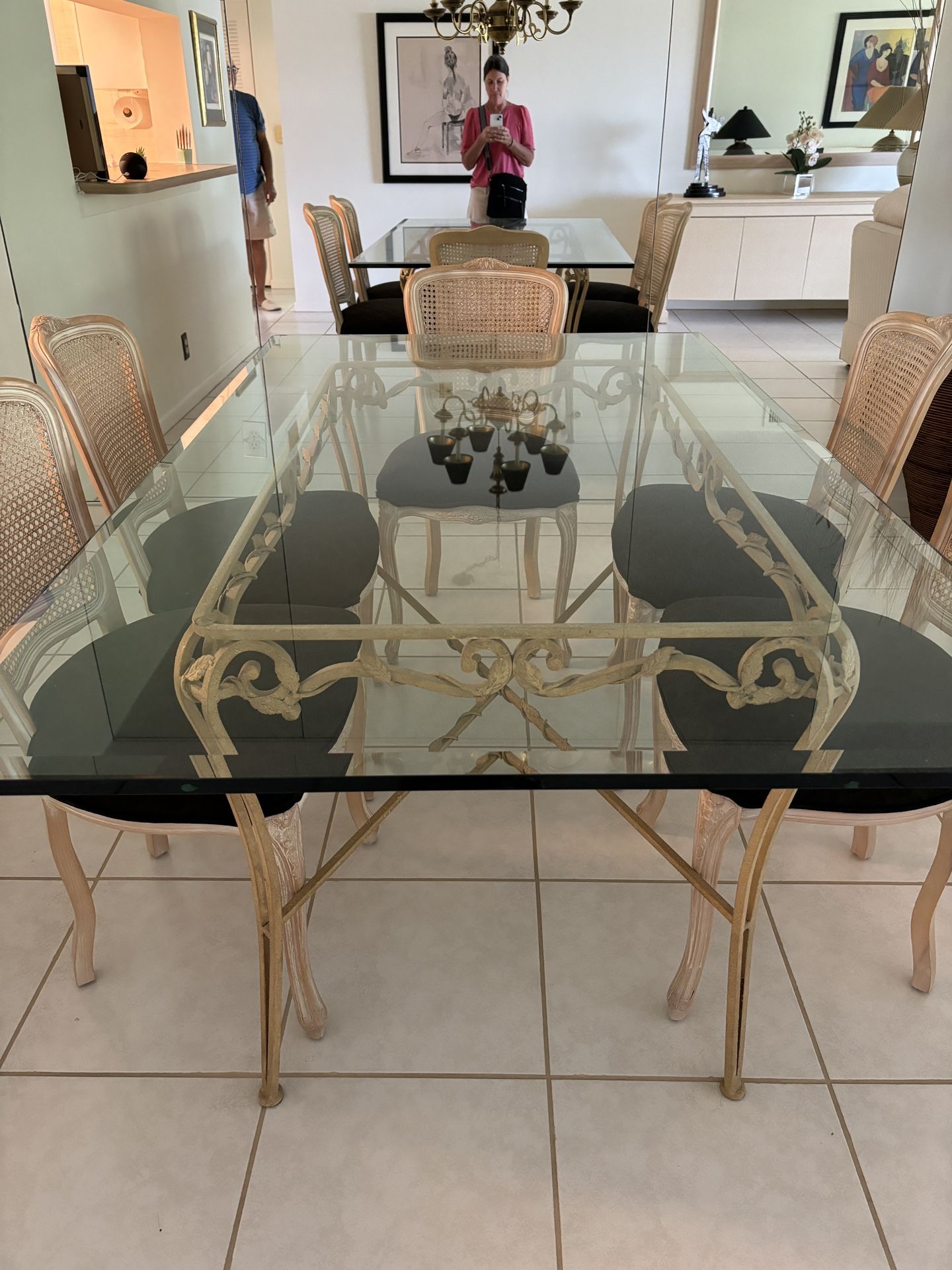 42”x72” rectangle table glass table. Iron base cream color. 6 chairs with black seats. Good condition.