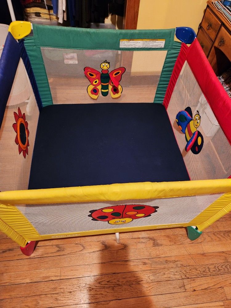 You can't go wrong with this purchase. It's well worthy. Fitted Mattress size is: 35 1/4 x 3 1/4 x 35 1/4. Well kept child extra wide Play-Pen that folds away with carry case. Has activity animals that sound on each side. Barely used, only at grandma's. 3" Mattress that fits perfectly with 2 blue mattress fitted sheets. GREAT CONDITION. LIKE NEW.