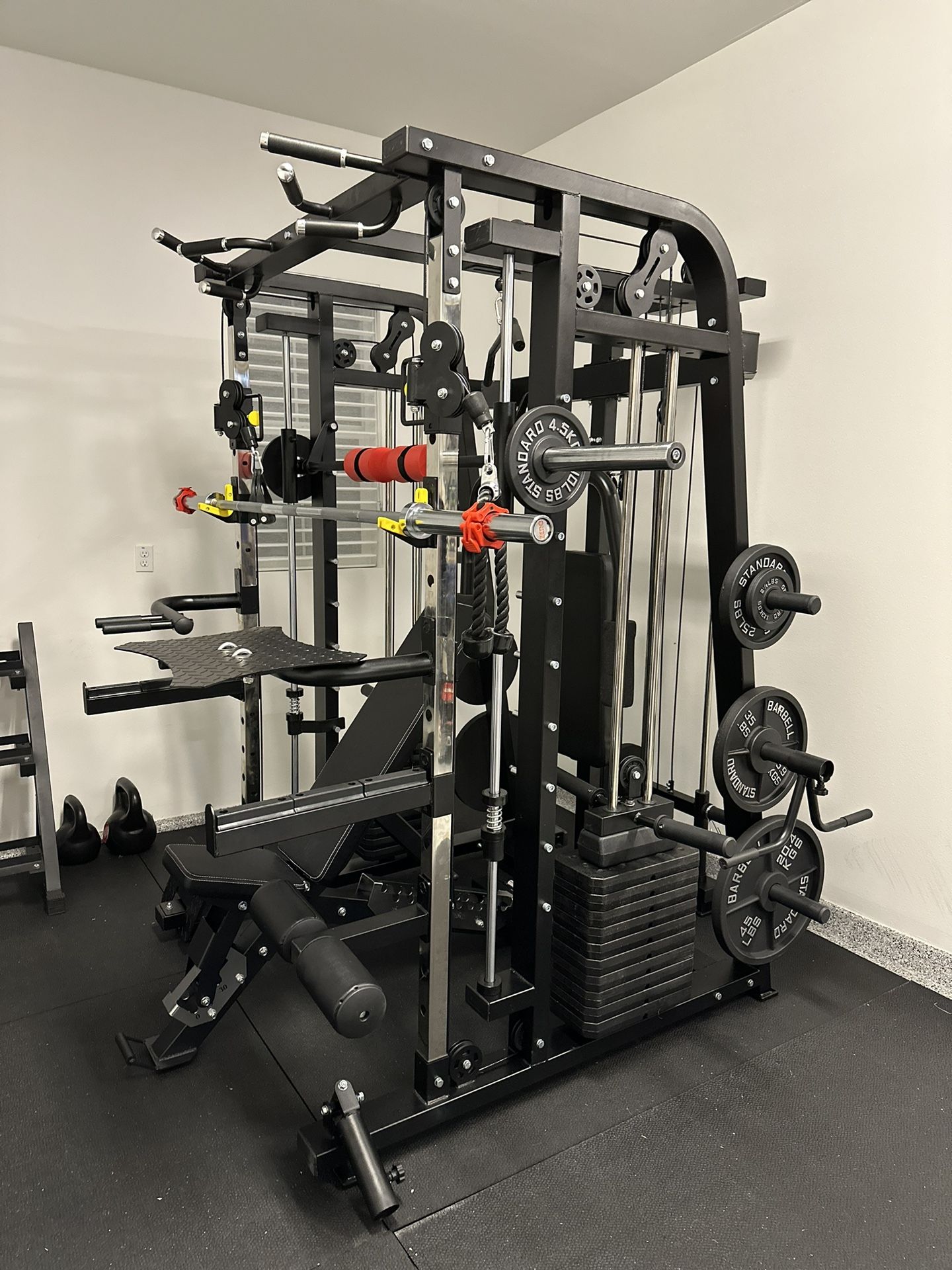 Smith Machine 300 Bundle 🏋️ New In Box! FREE DELIVERY/INSTALLATION AT FULL PRICE!Click Profile For More Gym Listings! Only Account! Cash / Credit Cards / Finance Available! WARRANTY INCLUDED Introducing the all-in-one heavy-duty commercial Smith Machine 300, the ultimate fitness station for any home or commercial gym setup. Designed with precision and durability in mind, this machine combines a Smith machine, power rack, and cable system into one seamless unit. Featuring a solid steel frame with precision linear bearings, the Smith machine offers a smooth and controlled movement, allowing you to perform a wide range of exercises with ease. It also includes adjustable safety stops and a dip station for added security when lifting heavy weights. The power rack section of the machine is perfect for heavy lifting, with an adjustable barbell catch and multiple height options. It also includes a pull-up bar for a complete upper body workout. The cable machine section is designed to target every muscle group, featuring multiple attachment points for various exercises. The cable machine also includes a weight stack, providing up to 125 pounds of resistance, and an adjustable pulley system for a customized workout. With a max loading weight rating of 1500 lbs and total floor spacing of 4 square meters or 43 Sq/Ft, this all-in-one machine is built to withstand even the most intense workouts. It also comes with a complete weight set of 290lbs, including a 7ft Olympic barbell and heavy-duty adjustable commercial bench with 1000 lbs capacity. With its versatility and functionality, the all-in-one heavy-duty commercial Smith Machine 300 is the perfect investment for any fitness enthusiast or gym owner looking to take their workouts to the next level. It also comes with a variety of attachments, including 2 handles, lat pulldown bar, straight bar, landmine, and dip bars, making it a complete all-in-one machine for any fitness routine. Constructed with heavy-duty materials and featuring a limited lifetime warranty, the Smith Machine 300 is built to last and provide a reliable and effective workout experience. With a total weight of 804 lbs and a maximum load weight rating of 1543 lbs, this machine is sure to meet all your fitness needs and more. Upgrades or Add Ons •Free Switch to 230lb Bumpers Plates 45s/35s/25s/10s •$40 3ft by 3ft Rubber Mats •$90 4ft 20lbs Curl OLYMPIC WEIGHTS GYM EQUIPMENT OLYMPIC STANDARD WEIGHT SLED PUSH SLED WEIGHTS WEIGHT PESAS SQUAT RACK POWER CAGE SMITH MACHINE BENCH PRESS INCLINE DECLINE BARBELL BAR HEX BAR BUMPER PLATES ADJUSTABLE BENCH FLAT BENCH BENCH DUMBBELLS DUMBELL ADJUSTABLE DUMBBELLS KETTLE BELLS DIP STATION PULL UPS PULL DOWN BATTLE ROPE BOWFLEX POWERTEC POWERBLOCKS HOIST BODY SOLID ROGUE FITNESS EXERCISE