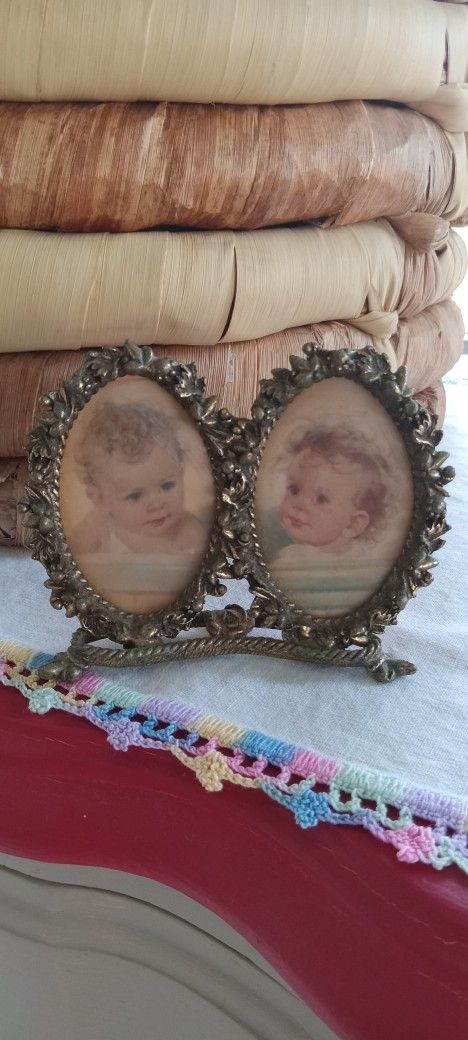 Vintage Metal.double Frame Baby Art 4"x3"