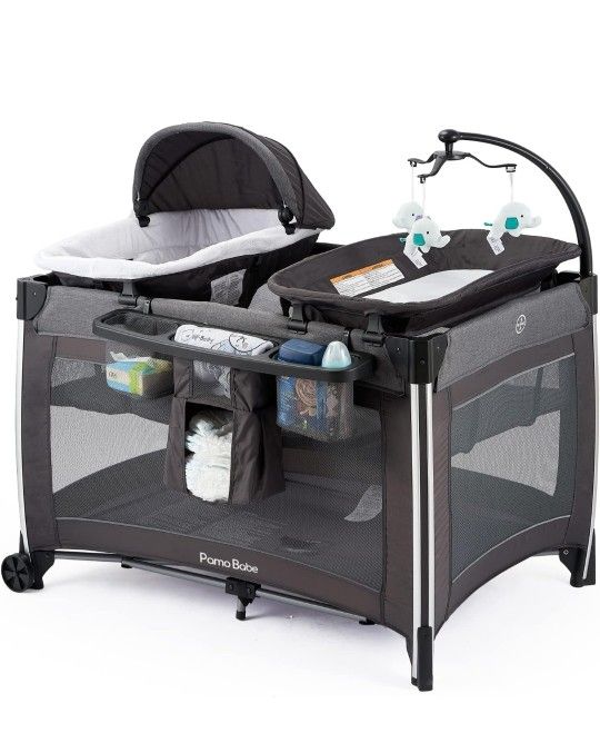 Pamo Babe 4 in 1 Portable Baby Crib Deluxe Nursery Center, Foldable Travel Playard with Bassinet, Mattress, Changing Table for Newborn, Infant, Toddler(Grey)