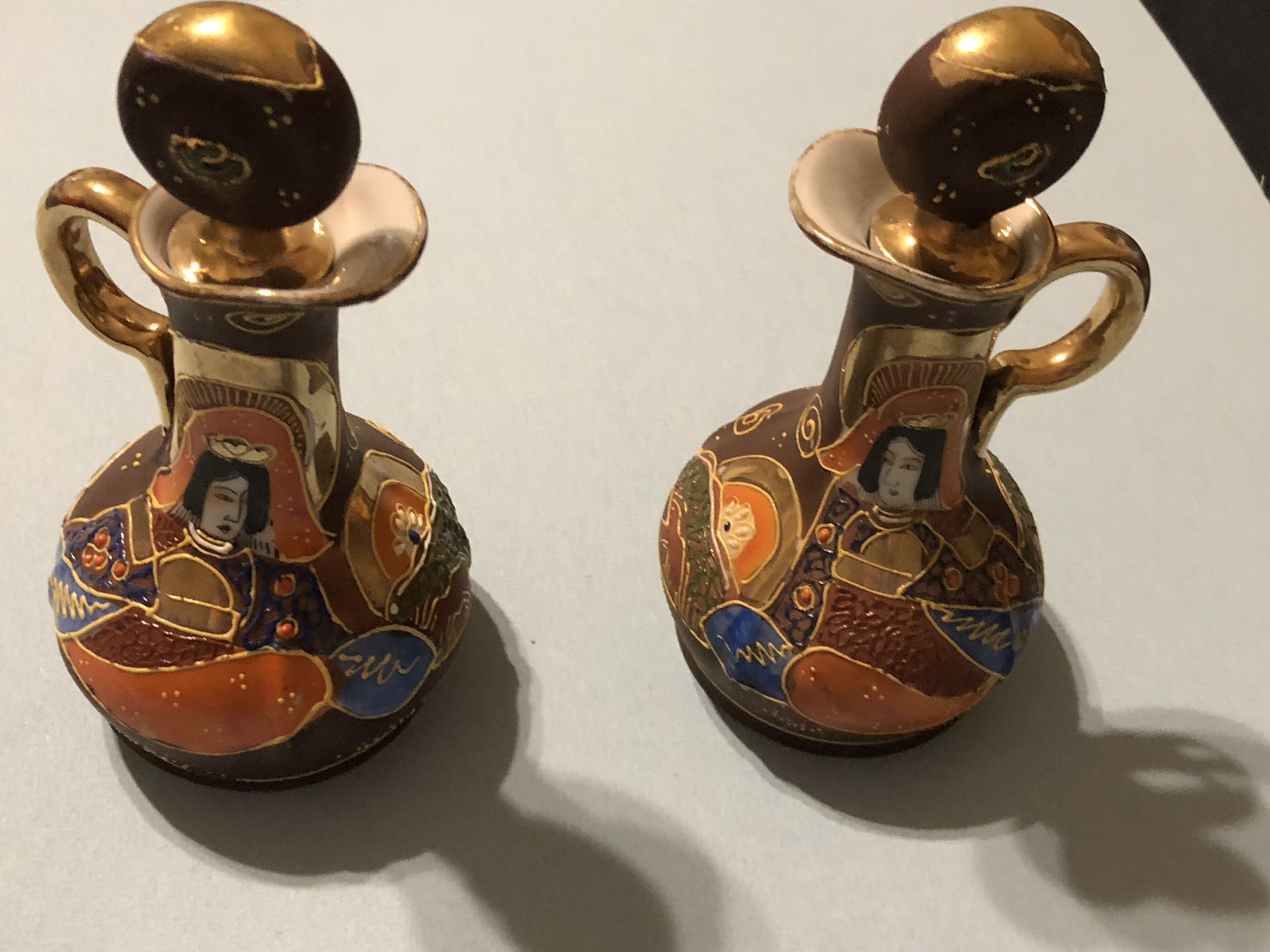 Vintage japan satsuma moriage enameled dragon ware oil and vinegar setand salt shaker