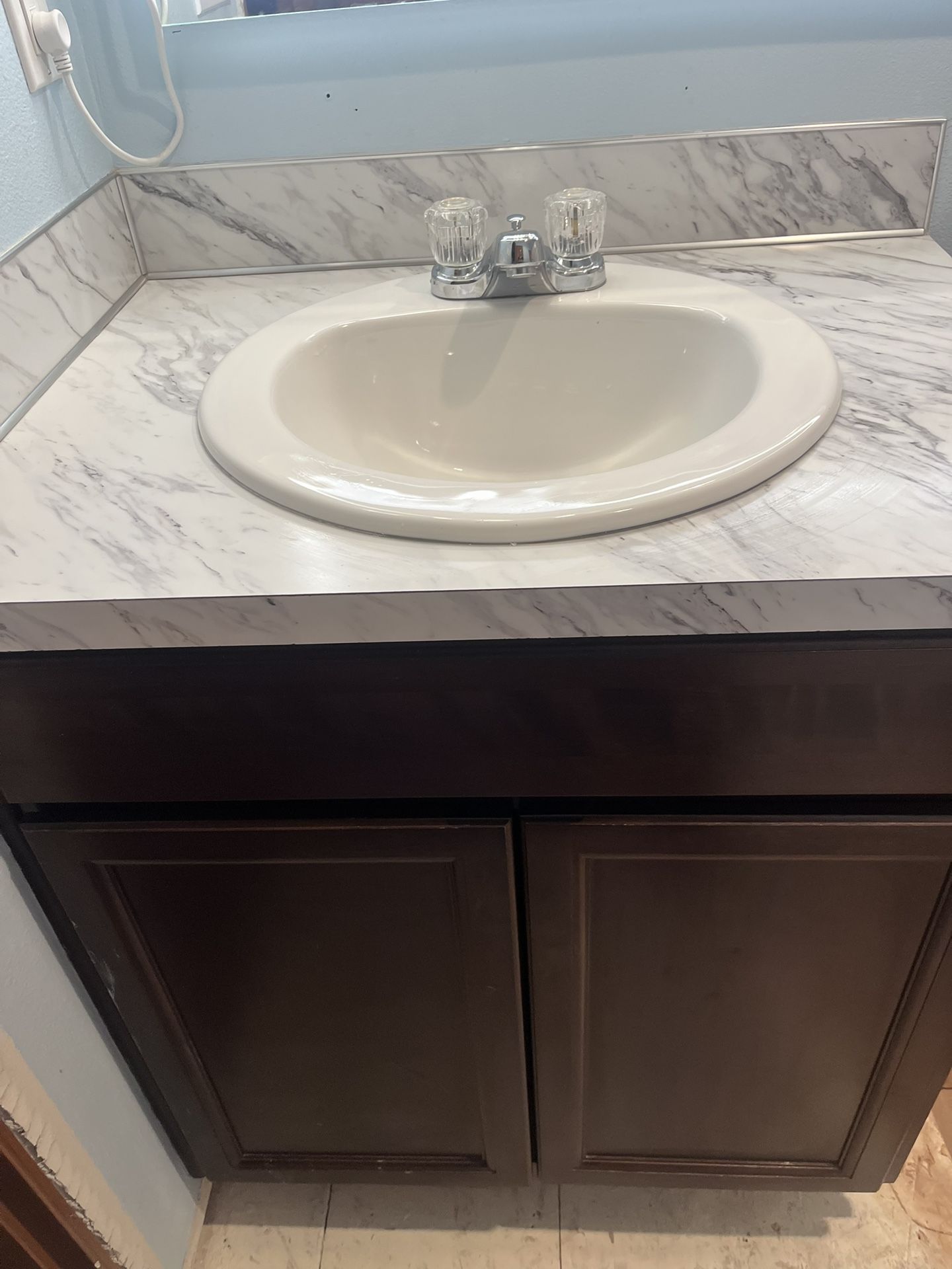 Real wood, comes With sink and faucet. Only a few years old. It came new when my house was built. Measurements are in the post. Lowe’s, Home Depot, and Wayfair all have a similar vanity alone for nearly $400, the ceramic sink $100, and the faucet $60 for this metal one. Pick up in Bonney Lake. Reasonable offers, cash only, and no trades please.