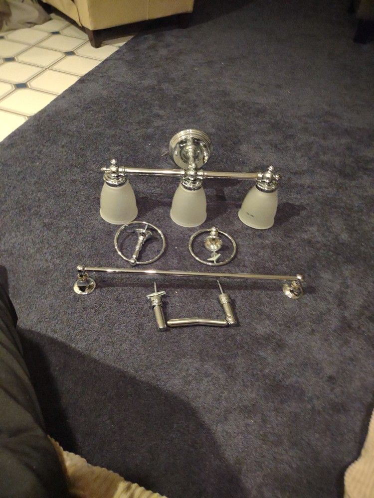 3 light over vanity or sink 2 towel rings 1 towel bar 1 toilet paper holder