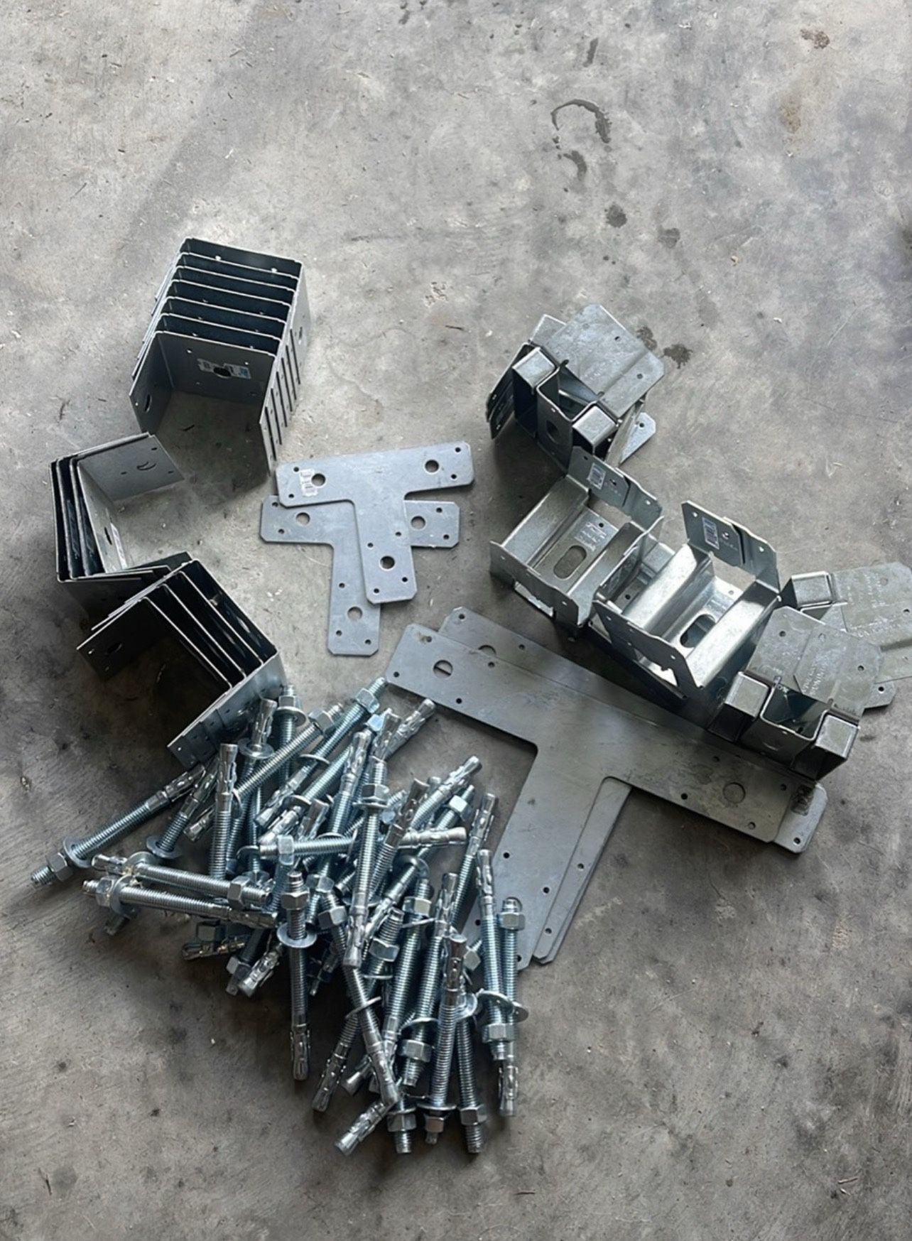 Galvanized steel post brackets, post bases, plates, and concrete anchor bolts. Heavy-duty construction hardware, ideal for decks, pergolas, fences, and framing projects. ✔️ New condition ✔️ Galvanized steel (rust resistant) ✔️ Can be sold all together or separately ✔️ Great for contractors or DIY projects Message me if you need specific pieces or quantities. Soportes, bases de poste, placas y pernos de anclaje para concreto en acero galvanizado. Material de construcción resistente, ideal para decks, pérgolas, cercas y estructuras. ✔️ Nuevos ✔️ Acero galvanizado (resistente a la corrosión) ✔️ Se vende todo junto o por separado ✔️ Ideal para contratistas o proyectos personales Escríbeme si necesitas piezas específicas o cantidades.