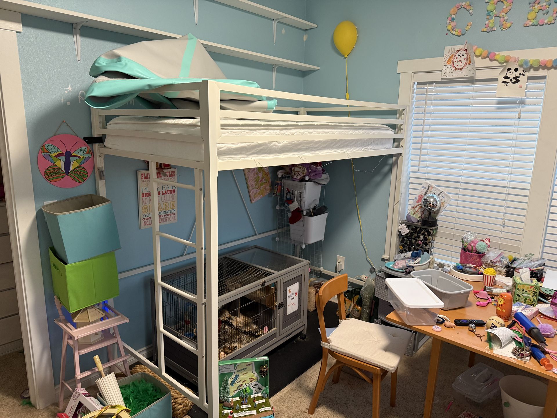 White metal loft bed with mattress. Used very little. Mattress has not been slept on. Loft bed came from Wayfair and mattress is from Amazon. Great condition. $75 for both.