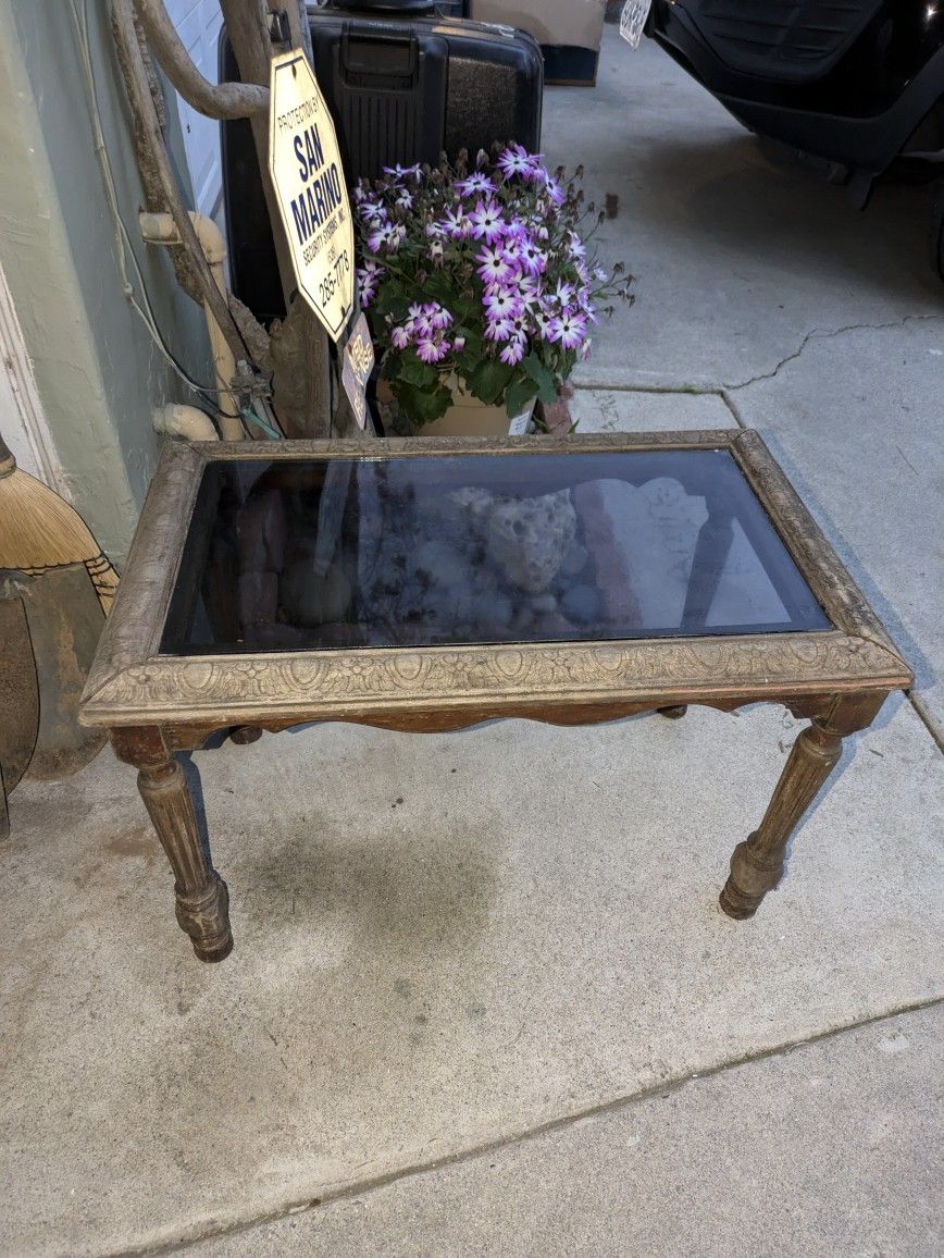 Beautiful little antique carved coffee table. Needs a little TLC but still adorable nonetheless. Measures 26 inches across, 16 inches in depth, 16 inches in height Asking $10