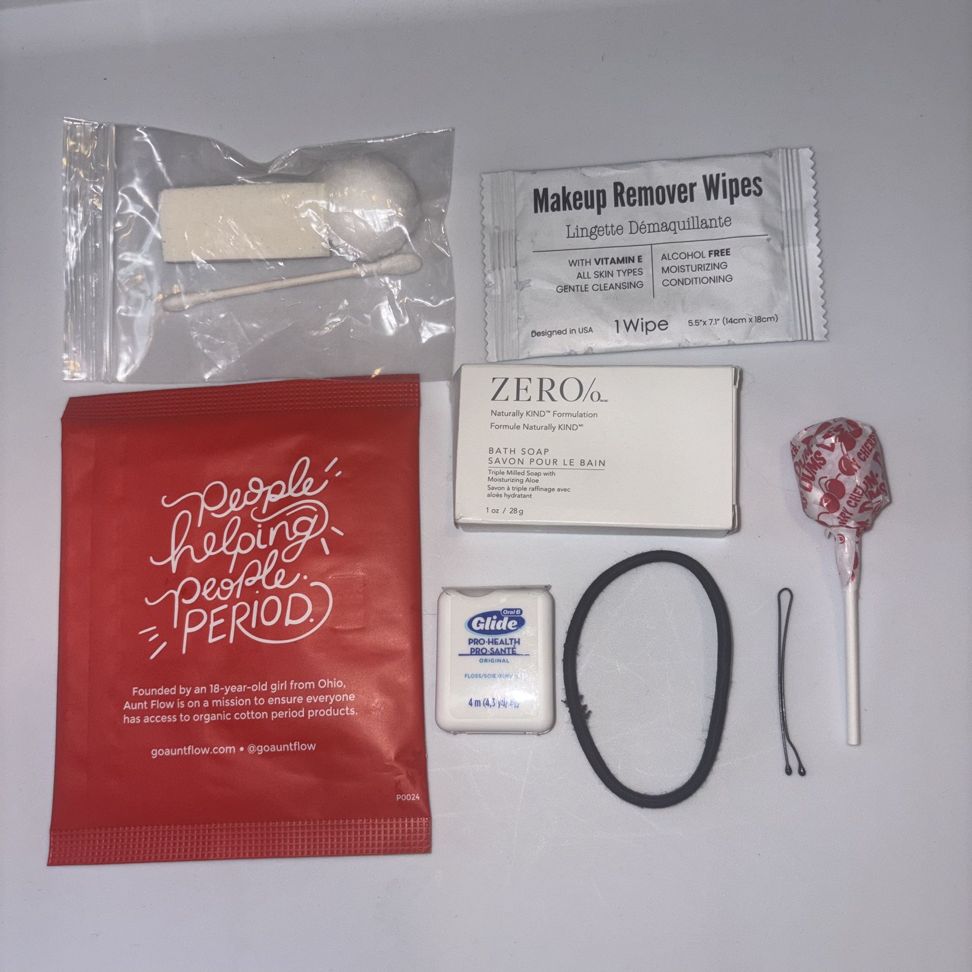 Includes: - Hair Tie - Bobby Pin - Cotton Ball - Q-Tip - Beauty Blender - Pad - Floss - Makeup Wipe - Soap Bar - Cherry Lollipop