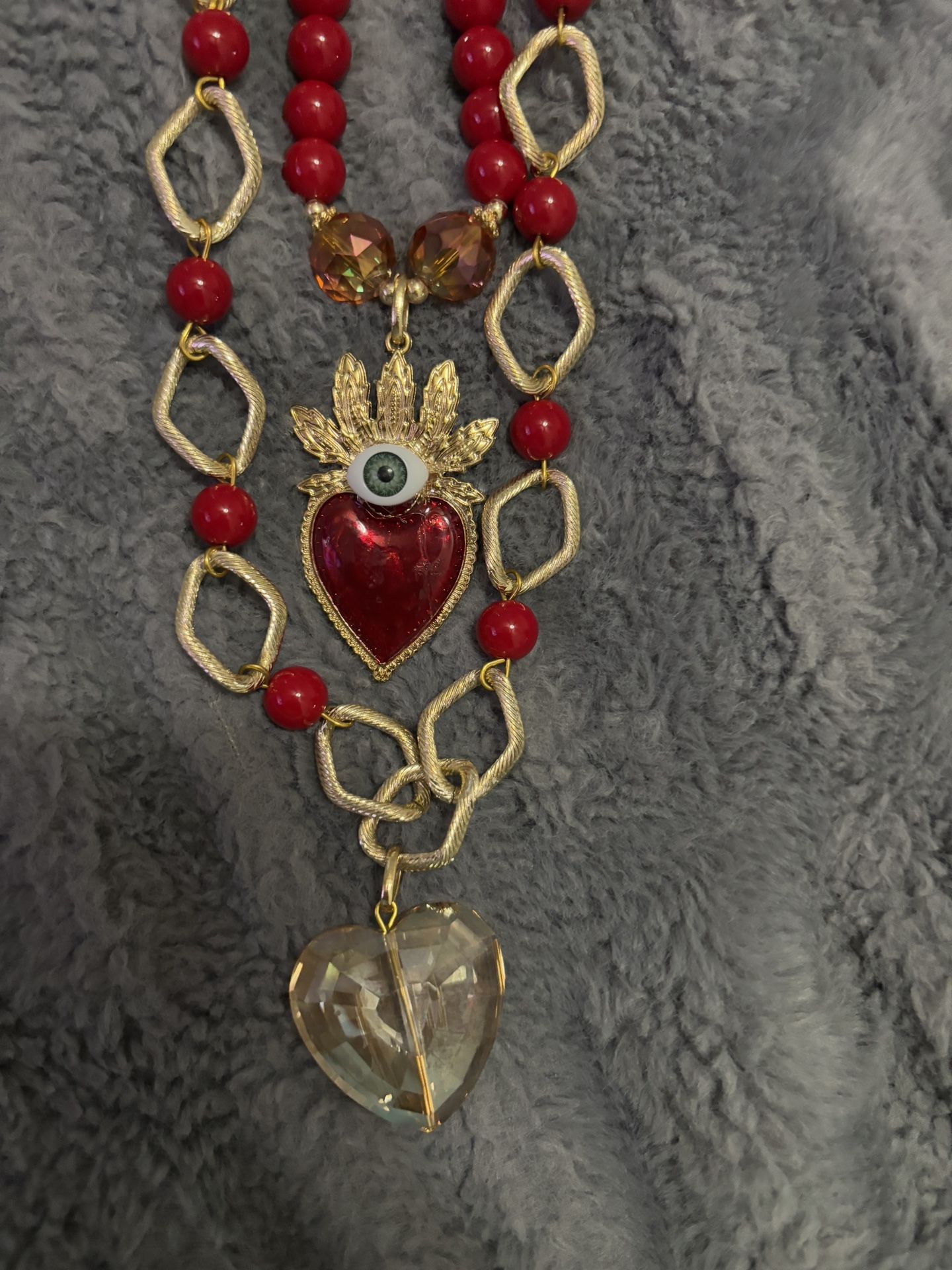 Beautiful Mexican artistry, red and gold (14k) necklace with eye includes earrings
