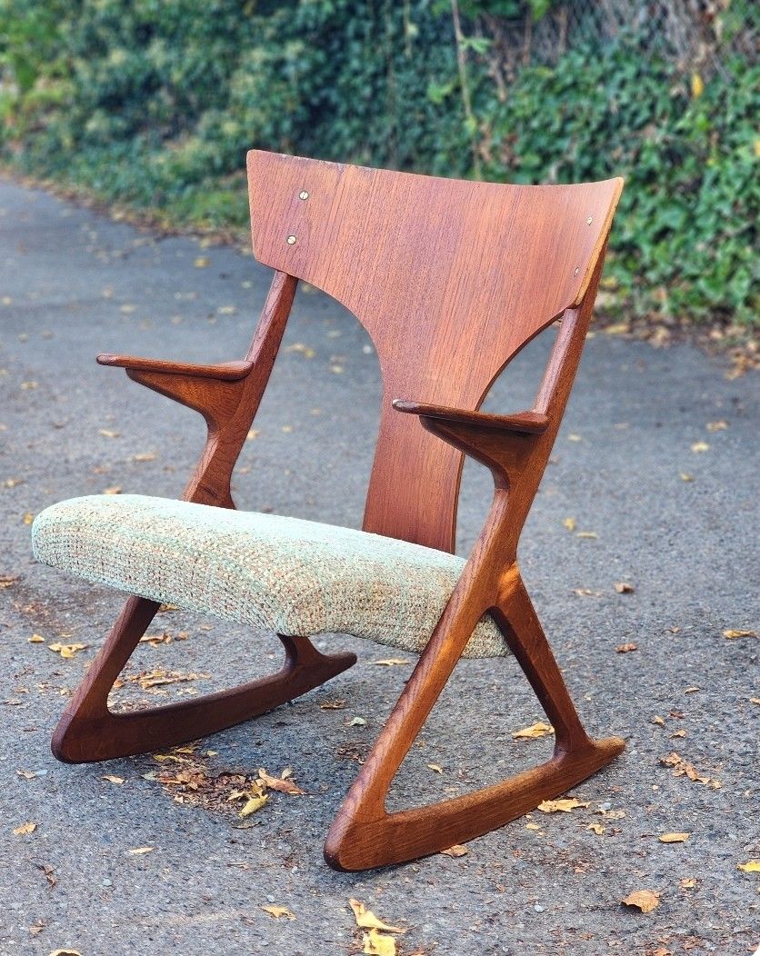 Refinished and reupholstered oak and teak vintage rocking chair with brass hardware. It's not perfect but it's close! This had been a long neglected piece of furniture, but it's ready for another 50 years of service now.