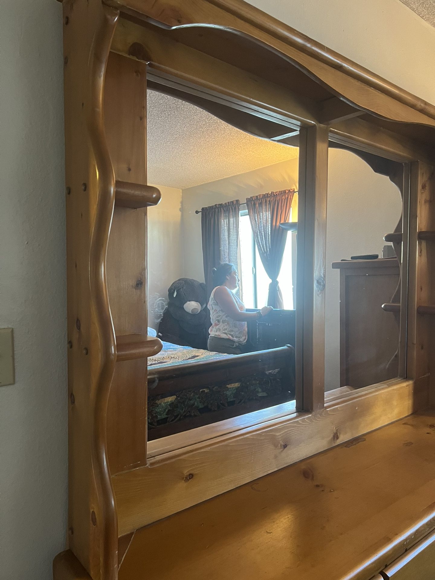 Solid wood, nine drawer, dresser, and mirror.
