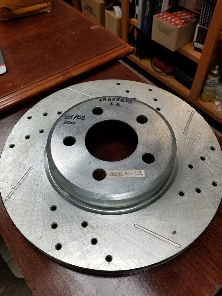 ****For Sale**** 1 pair of Chrysler Front drilled and slotted brake rotors. There is a lot of Chrysler vehicles these rotors fit. OfferUp will not let me put a link on this ad... The part numbers are AR8358XR or AR8358XL I know they fit a 2005 to 2008 Chrysler 300 base and they fit several chargers magnums and other Chrysler products Brand new....