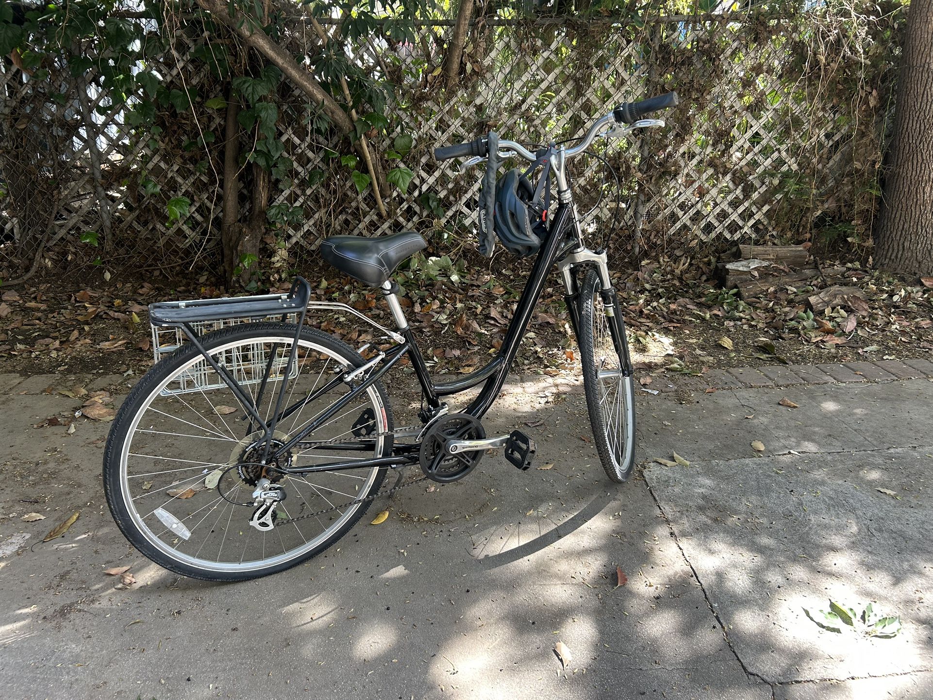 This bike is a great everyday bike, really comfortable for cruising around. I am a 5'4" woman and it suits my size perfectly, but the seat is easily adjustable and can suit anyone a bit shorter or taller. It's has a great rack for strapping a bag on, and a metal folding basket attached that you can use for extra storage. If you buy it I'll include the helmet and lock if needed. I originally bought the bike new for $500+ from Coco's Variety on Riverside, a great bike shop.