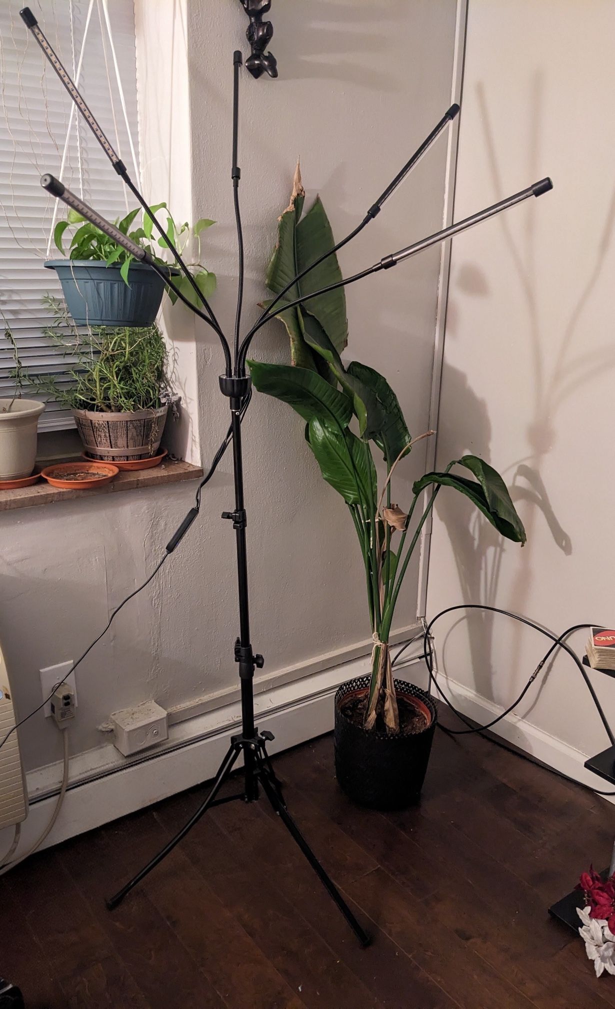 5-head plant grow lamp. Has an inline as well as a remote controller to adjust brightness and set timer for automatic lighting. The tripod has adjustable height.