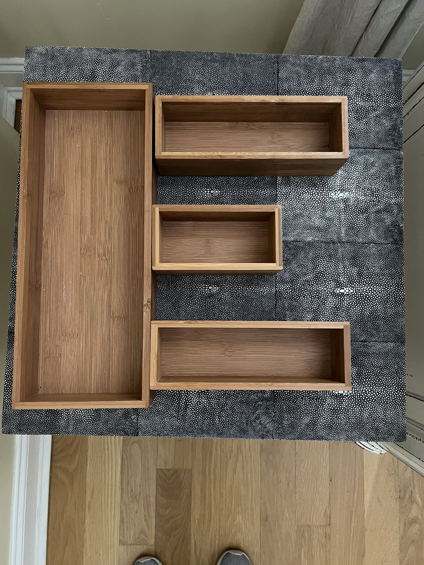 Set of 4 wood organizers Like new condition Good for sunglasses, watches, small jewelry Sizes- all 2” deep 15” x 6” 9” x 3” 6” x 3”