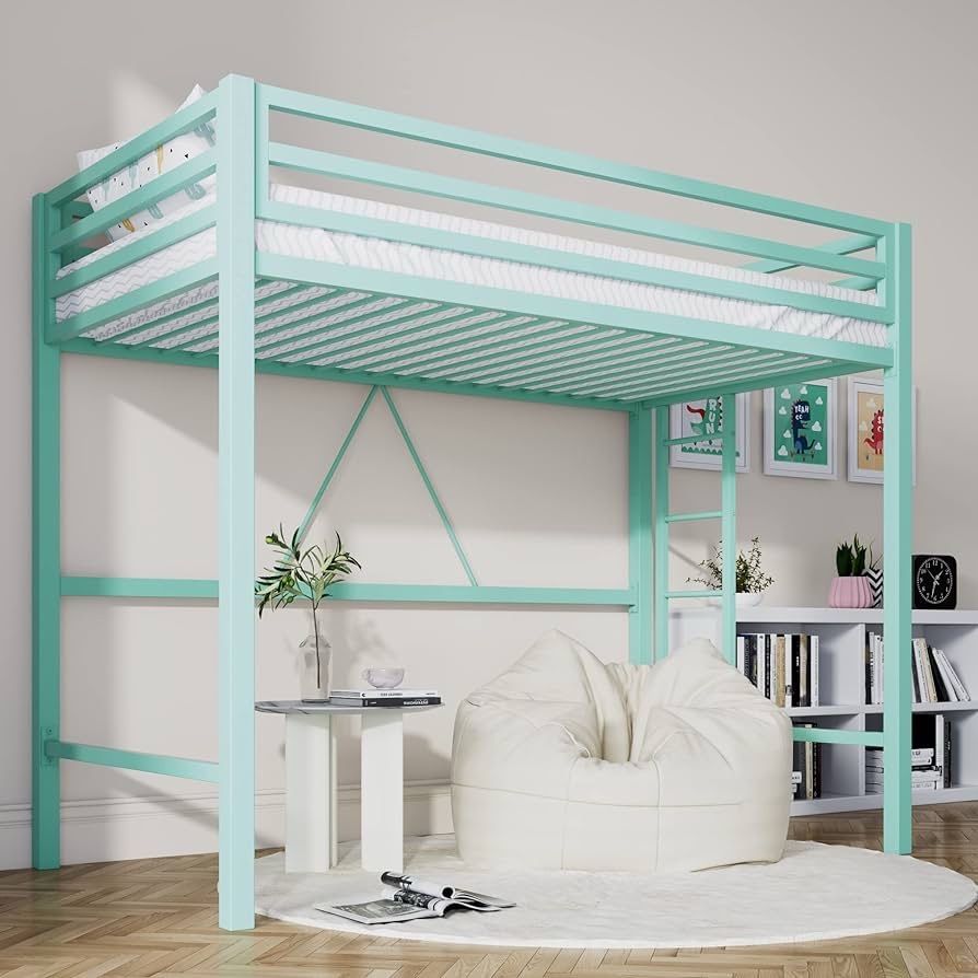 O646 $100 Loft Bed Twin Size with Ladder and Guardrail,Heavy Duty Metal Slats Support No Box Spring Needed Small Space Saving Furniture for Bedroom Dorm,Aqua Blue Top highlights Size Twin Loft Material Metal Product Dimensions 77.6"L x 41.3"W x 71.9"H Style Modern Special Feature Squeak Resistant Color Aqua Blue Durable Square Tube Frame: The sturdy square tube frame provides maximum support with a weight capacity of 300 lbs, ensuring safety and stability for a good night's sleep. Expand your space: The area under your bed can be used for studying, working, resting, playing, or even storing your stuff. Large space to maximize your space. Removable Ladder: The ladder can be installed on either side of the bed, making it easy to customize to your room's layout and your personal preferences. Noise-Free Design: The bed features a mute buckle design to prevent noise from moving slats, allowing for a peaceful and uninterrupted sleep. Easy Assembly: The twin loft bed ships ready to assemble with step-by-step instructions and tools included. It can be assembled by two people in just 30 minutes, making it a hassle-free option for busy parents. Note: For your safety, the mattress on the upper bed must be at least 5 inches (127 mm) below the top edge of the guard rail. 1029591-3