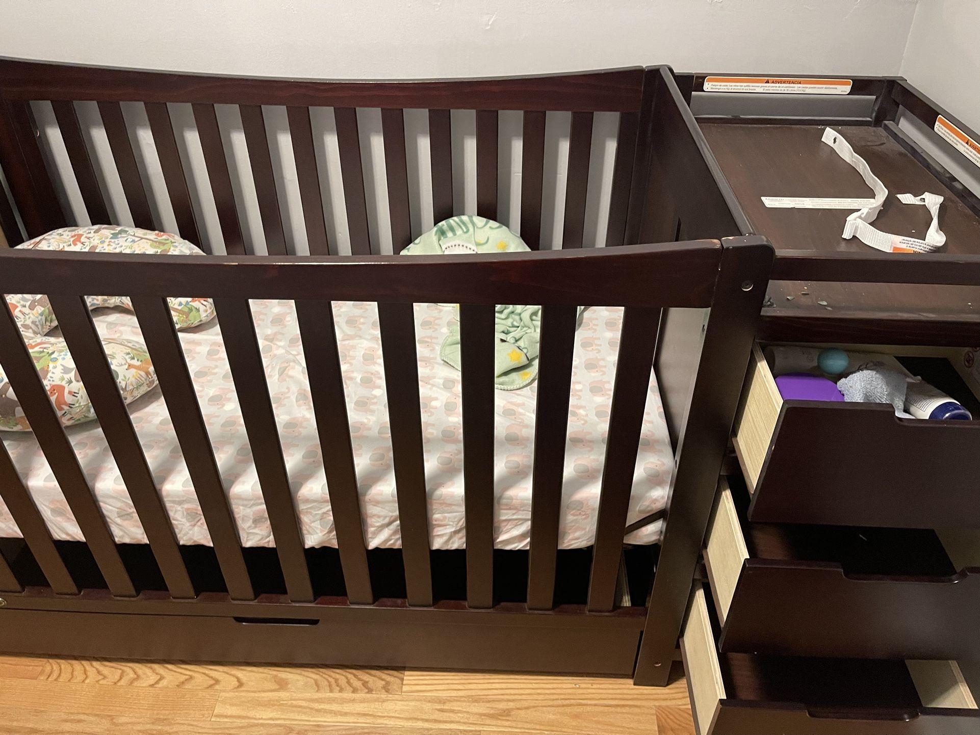 Only a little over a year old, my daughter barely used it. It sat in storage for a bit but is in great condition. Small little scratches. Comes with the mattress and changing table cushion.