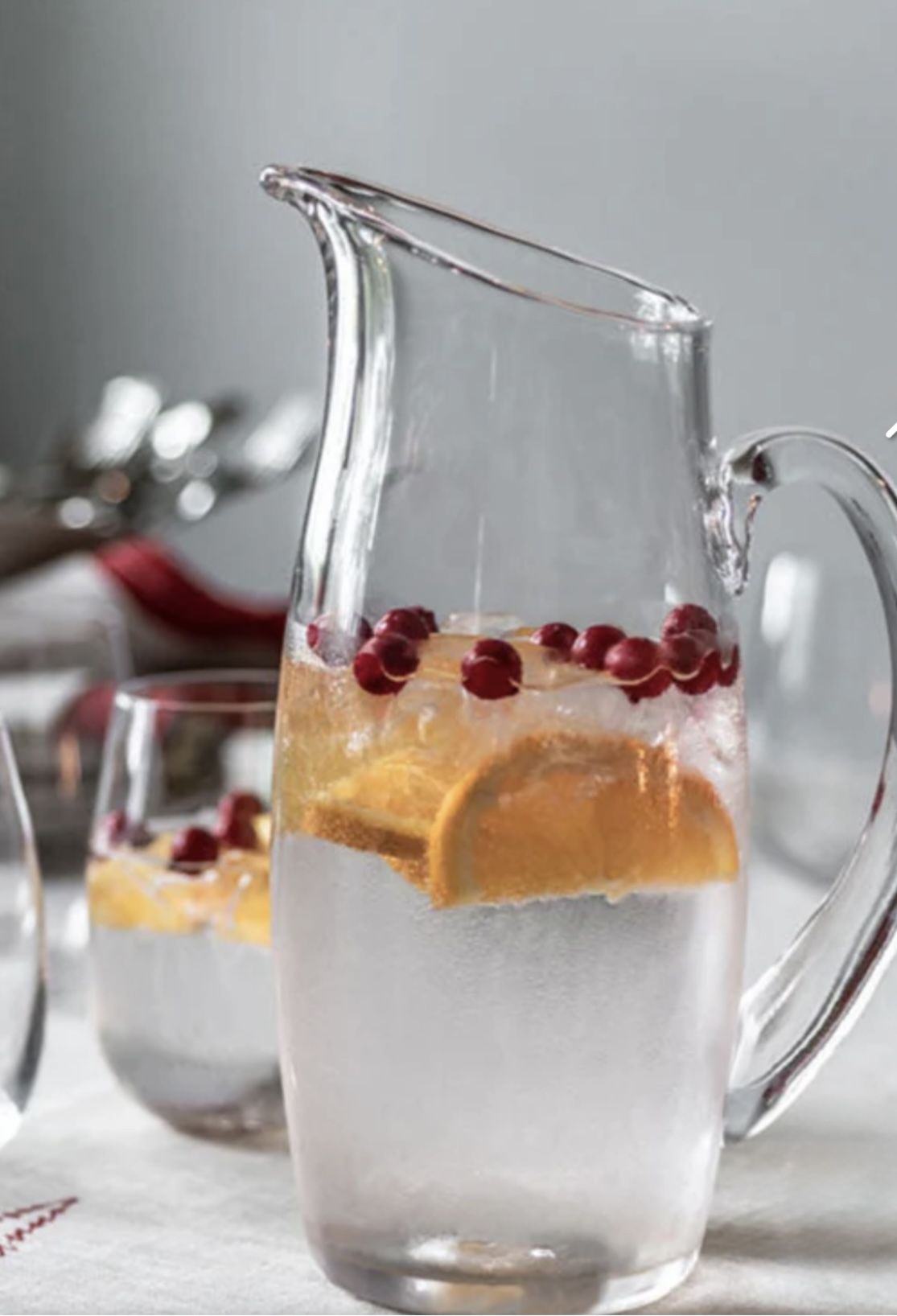 It's made of non-lead European crystal, making it durable and elegant. It has a contemporary style with a pierced handle, adding a touch of sophistication. Perfect for serving iced tea, lemonade, water, or mixed beverages