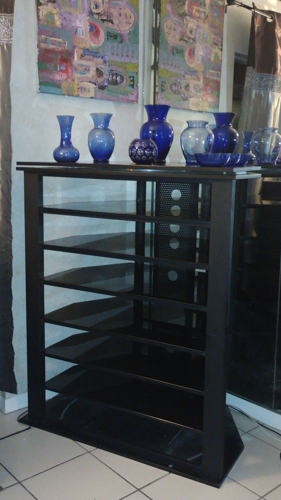 If this ad is here, then yes it's available!!! Open to reasonable offers Beautiful Modern and Classy Black Metal Shelving Unit Has 6 thick black Smoked Glass Shelves with full metal support under each shelf, generous clearance between shelves, has round openings in back for wiring at each shelf level, and Black wooden Swivel Top and wood base Dimensions: 40 wide x 25.5 deep x 49 high Can be used as center or corner unit. Very roomy and a beautiful modern piece! Great for TV on the top that swivels, and electronics like HiFi system components, gaming consoles, media streamers, cds, dvds, VR equipment etc, and has round openings in back for wiring and each shelf level . Disassembled and ready for pick up Super easy to reassemble simply 2 large metal sections then add glass shelves. Can be picked up at: 2731 NE 14 St, Pompano Beach, FL, 33062 Located east of U.S.1 / Federal hwy CASH ONLY/All Sales Final TV television monitor Stereo Sound hifi System Audio Electronics Corner furniture shelving shelf entertainment center wall unit video Blue decorations on top of unit NOT INCLUDED.