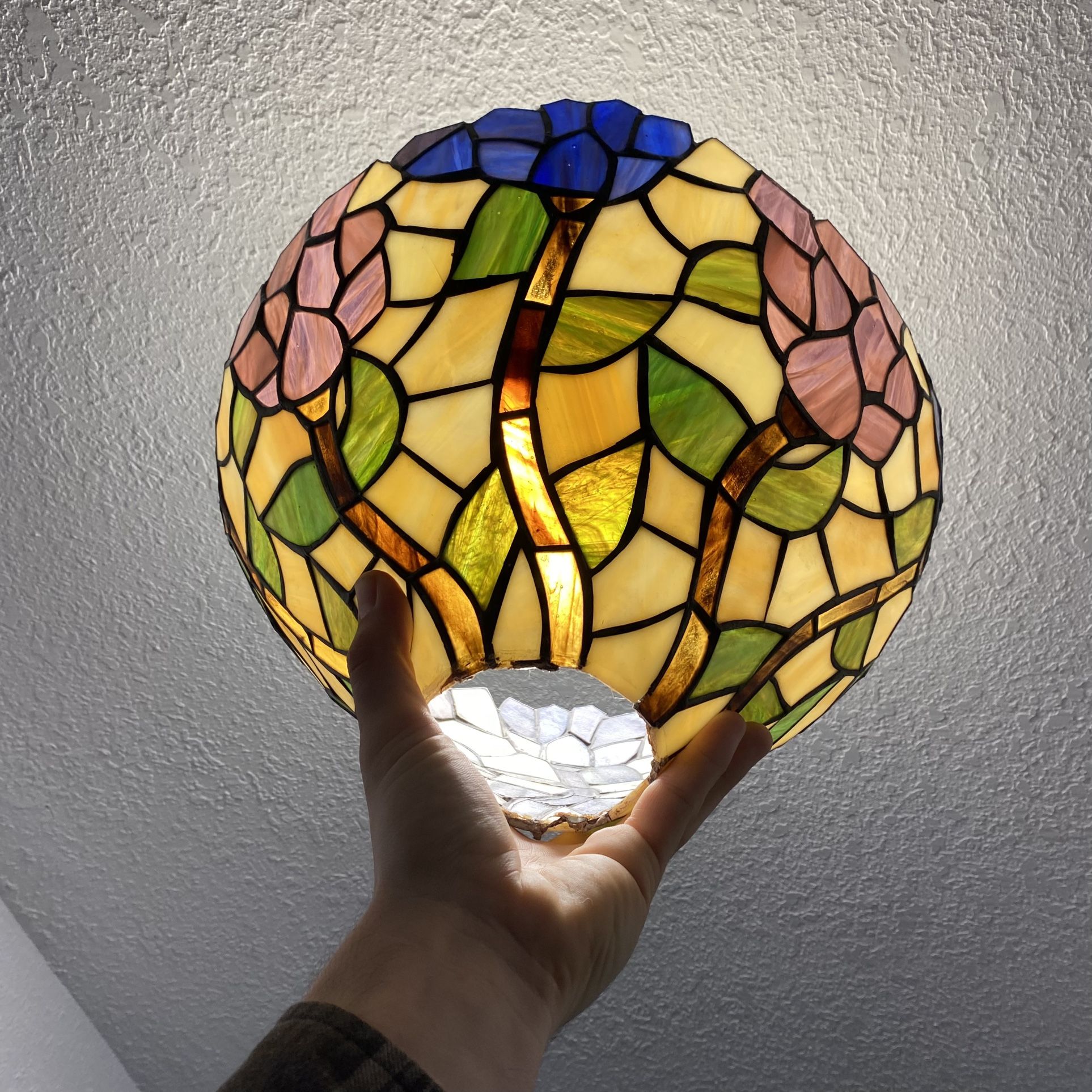 Good condition lamp shade. Stained glass. Looks beautiful in the light! Mounting hole about 3.25”. 13.5” at its widest & 7.5” height.