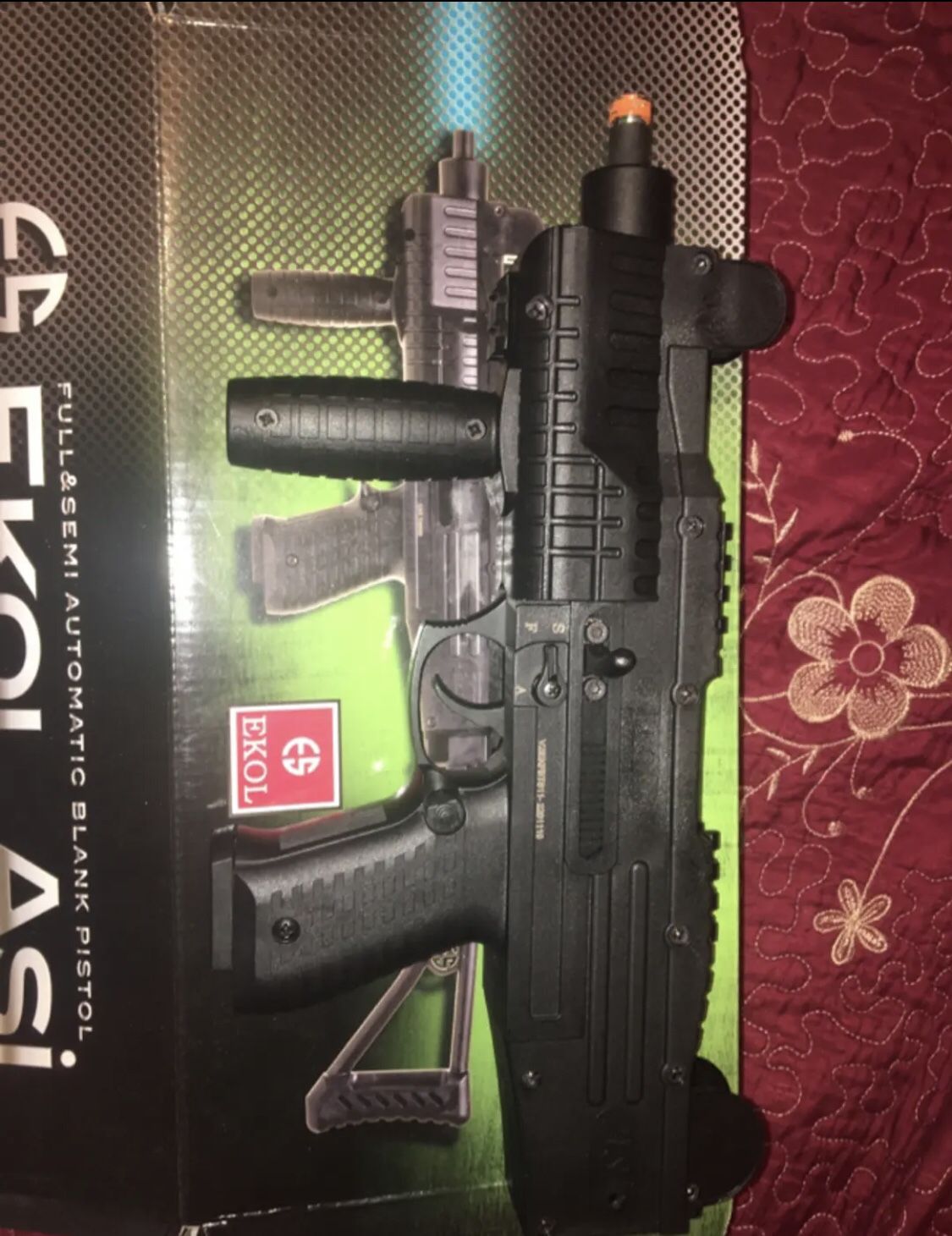 Ekol blank front firing U ziiii Sounds like a real one Can use it for new years as fireworks NOT REAL ONLY WORKS WITH BLANKS ! NewYears Eve , Can send videos of it working . Bought it for 170+ shipping . Got the box and scan code where you can scan it as you can see in the pictures .