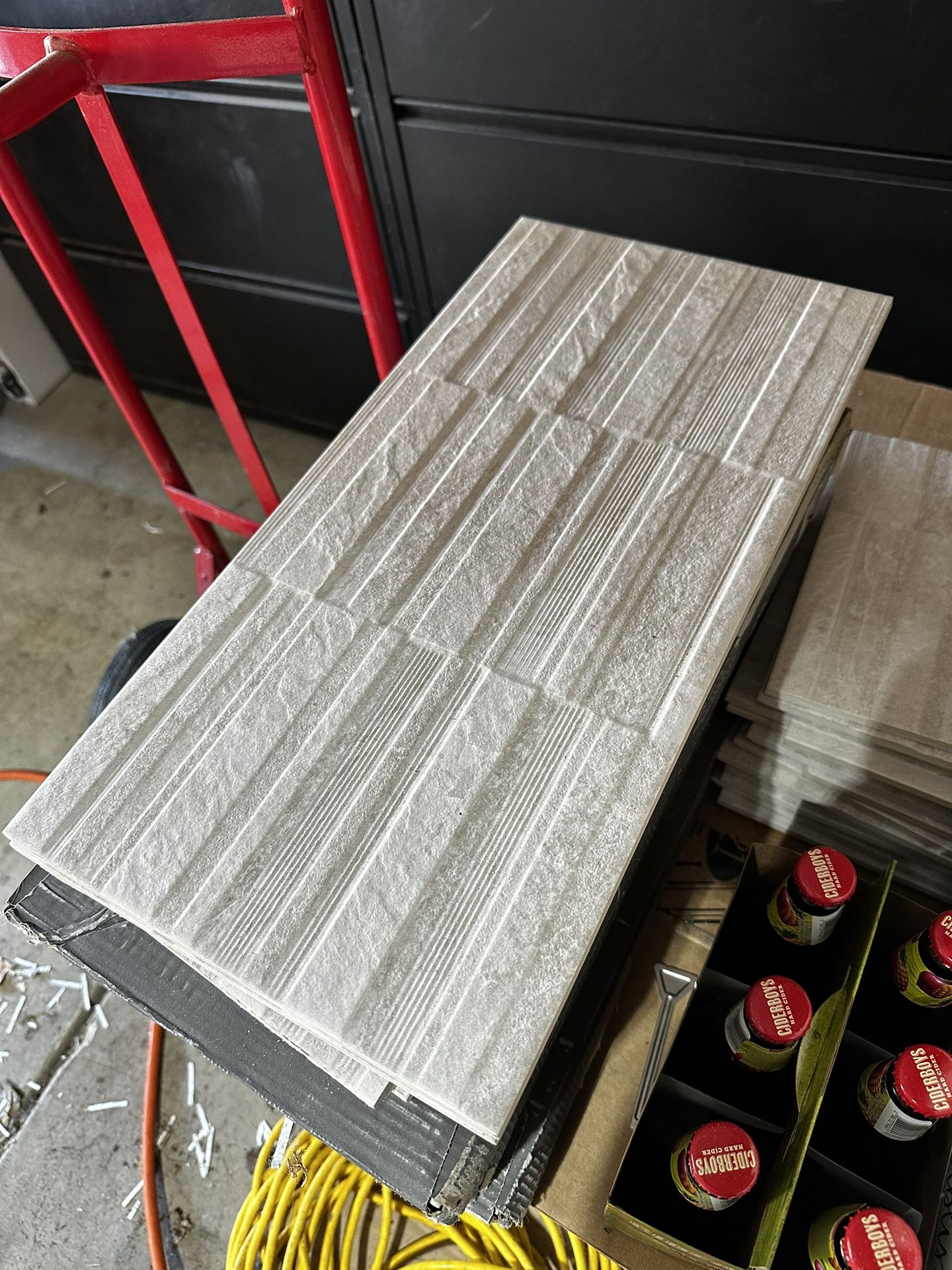 GORGEOUS tile with texture and a matte finish. Fell in LOVE with it. Nice large size, neutral color, and very inexpensive to purchase additional tile from Home Depot (see third picture). I have two Full boxes and a bunch of scraps. 1 box covered 10.76 ft. Located near Farnsworth and Indian Trail.